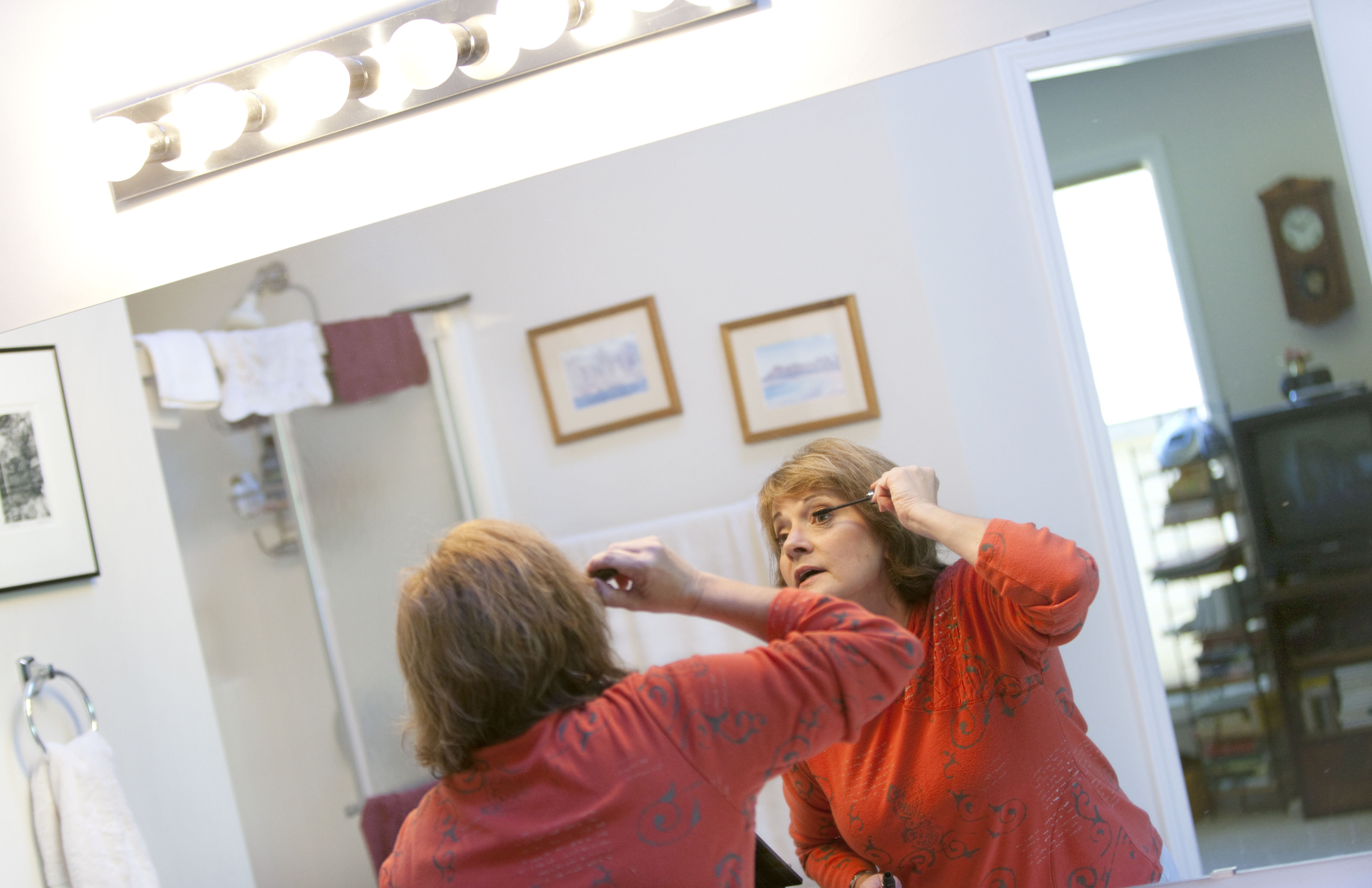 Sandy Cooper, a Lawrence Mary Kay representative, applies mascara Wednesday at her home.