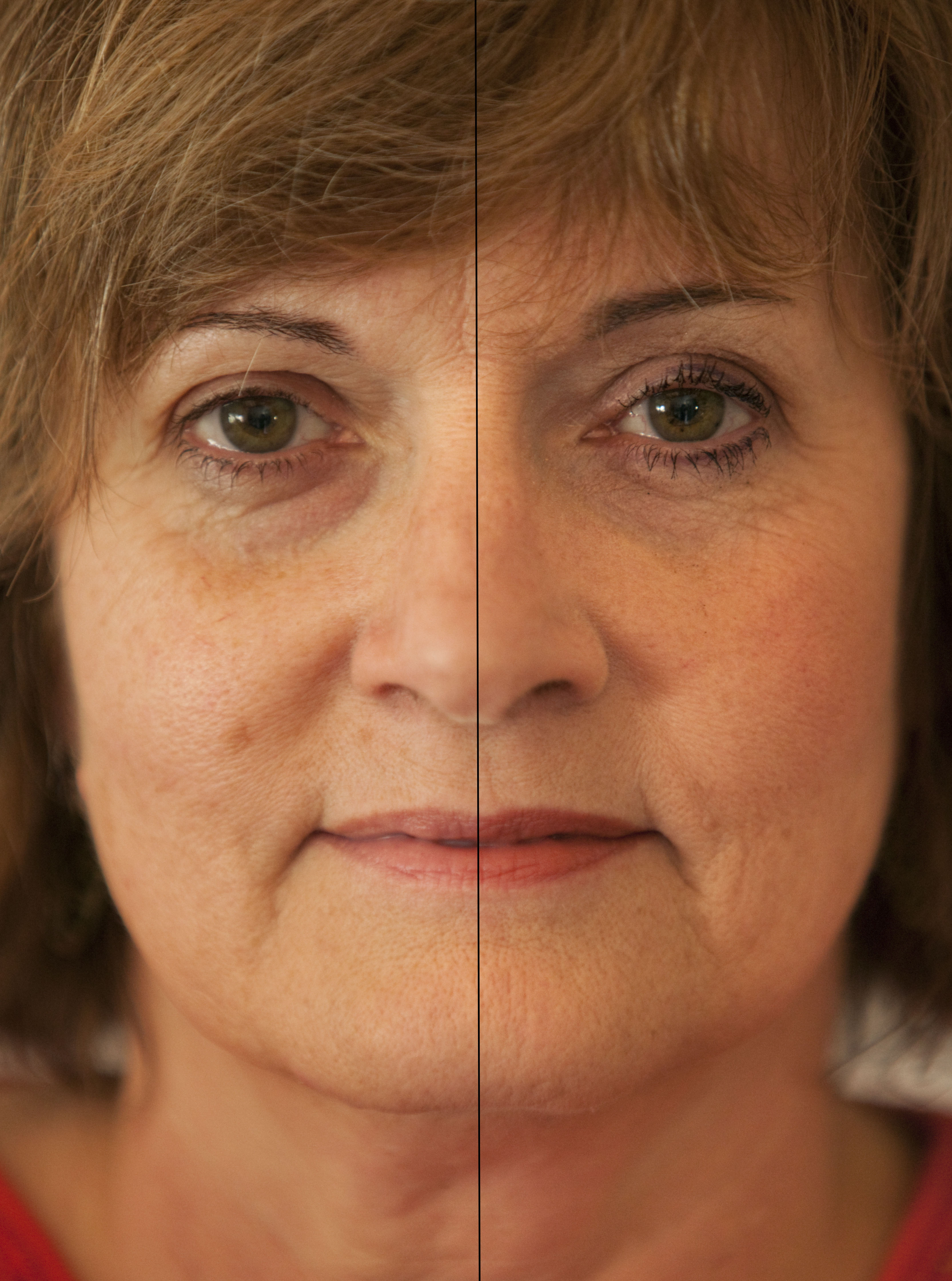 A cross section of Sandy Cooper shows a left side without makeup and a right side with it applied.
