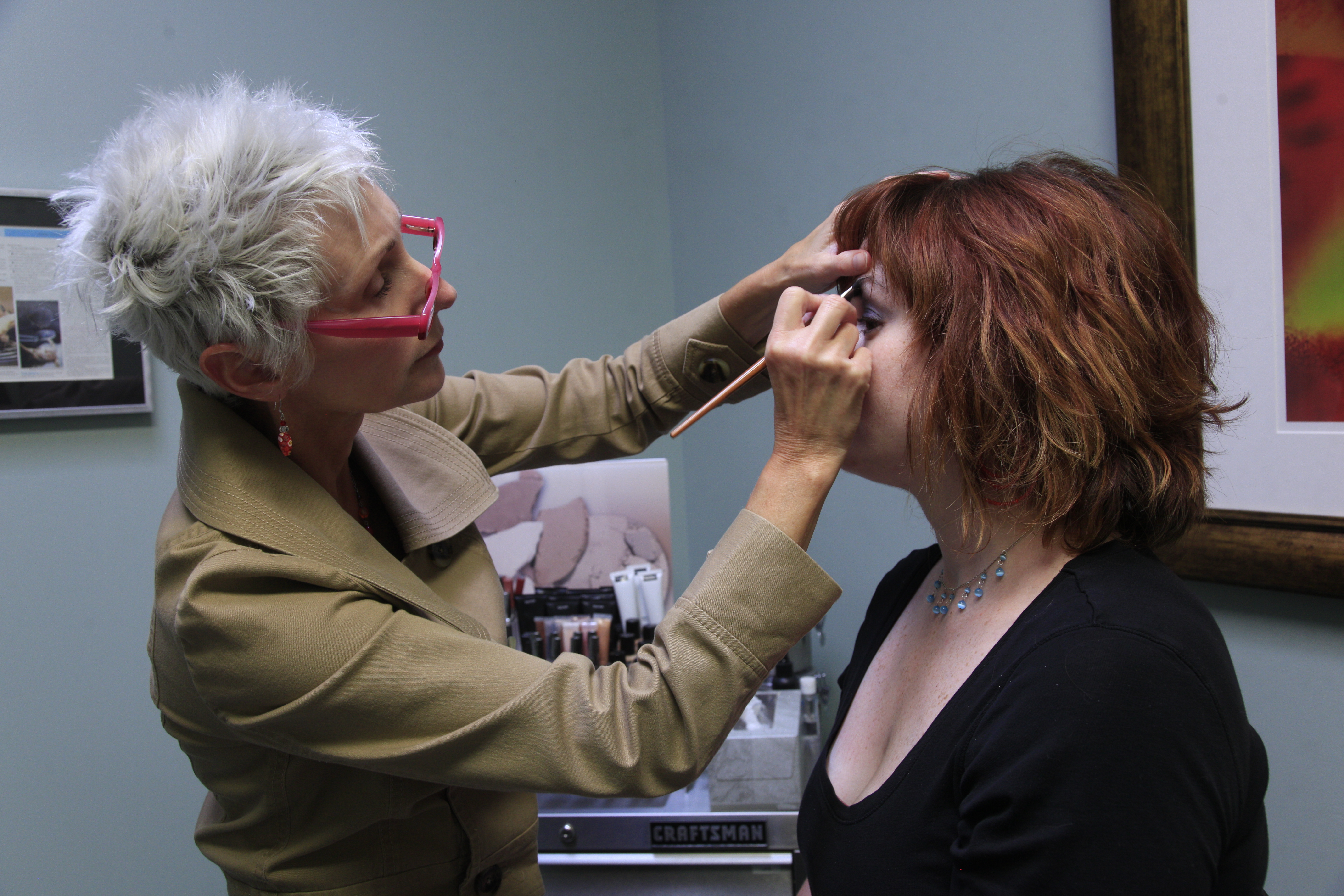 Pam Biemick works on client Regan Lehman Pillar recently as Biemick showed her client how to use a primer and concealer.
