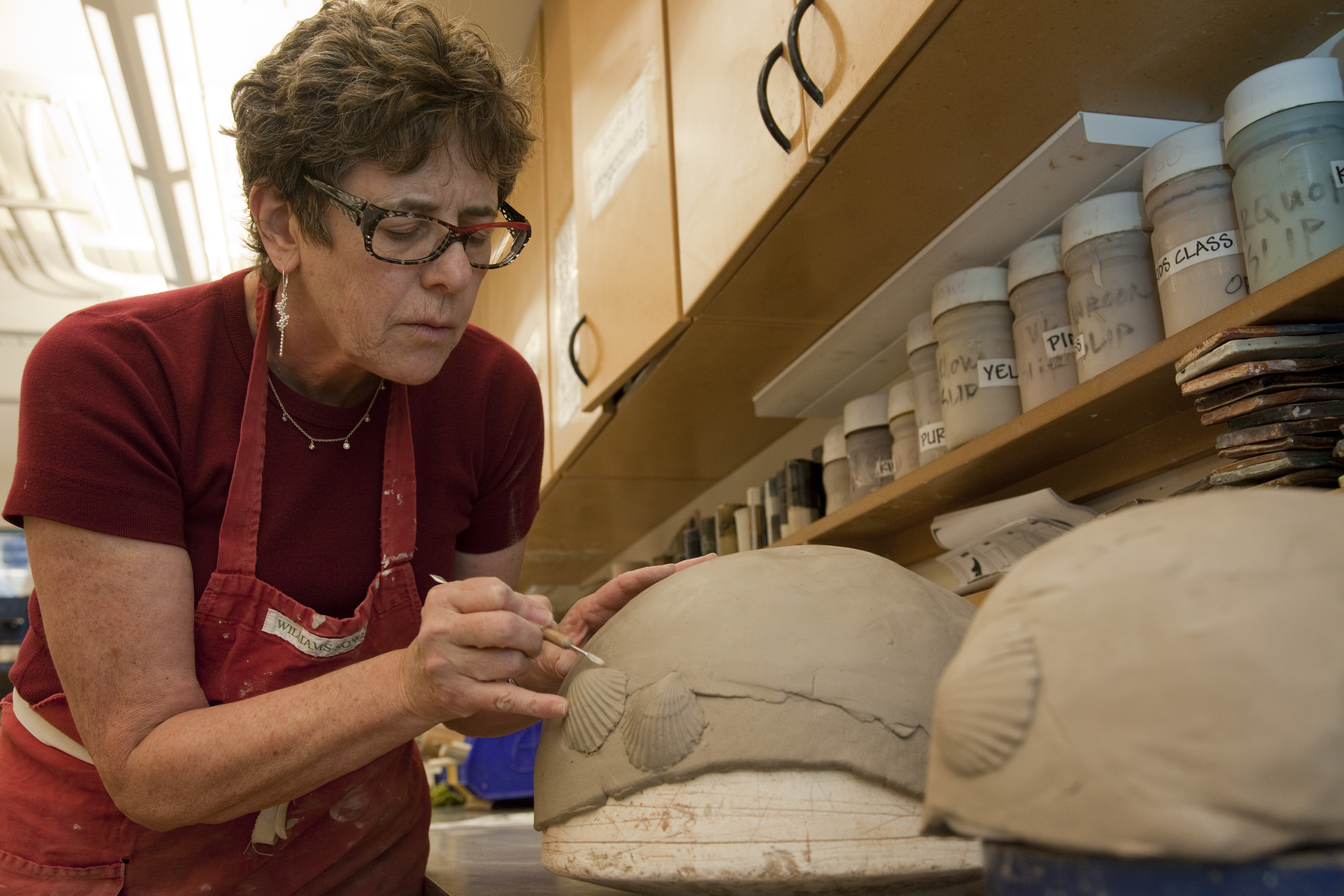 Leni Salkind, Lawrence, works on trimming press molds of sea shells in the ceramic studio at the Lawrence Arts Center on Tuesday. The center offers a wide array of art projects for people of all ages.