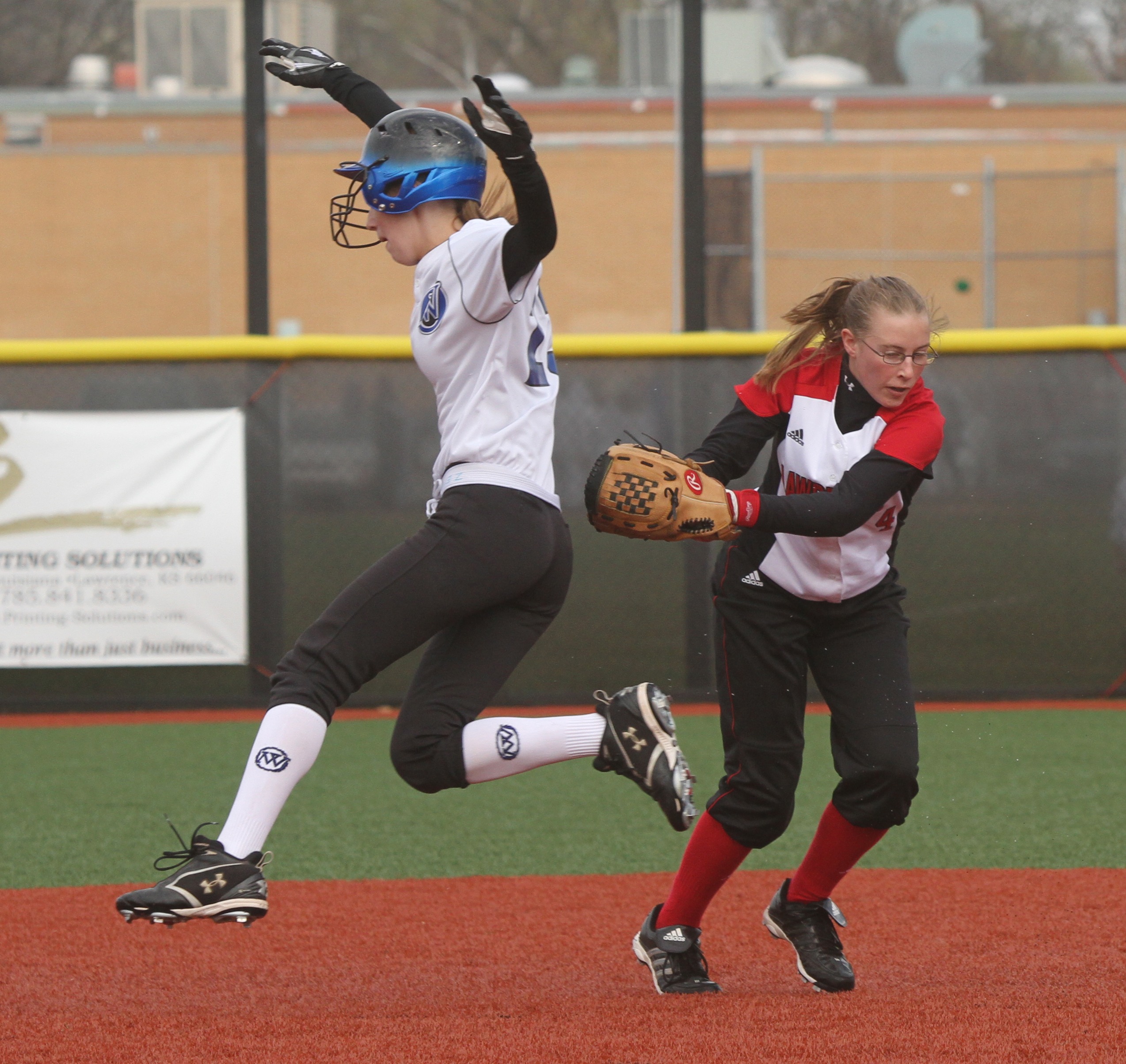 Lawrence High junior second baseman Mallory Reynolds, right, makes the tag on Olathe Northwest’s Julie Kern on Thursday at LHS.