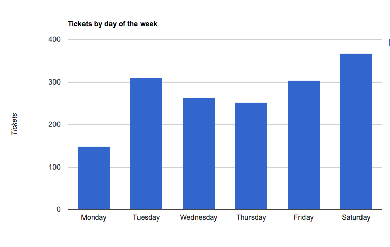 • When the temperature hits 100 degrees, the average tickets per day dips to 122. When it’s above 90 degrees, the average is 183.