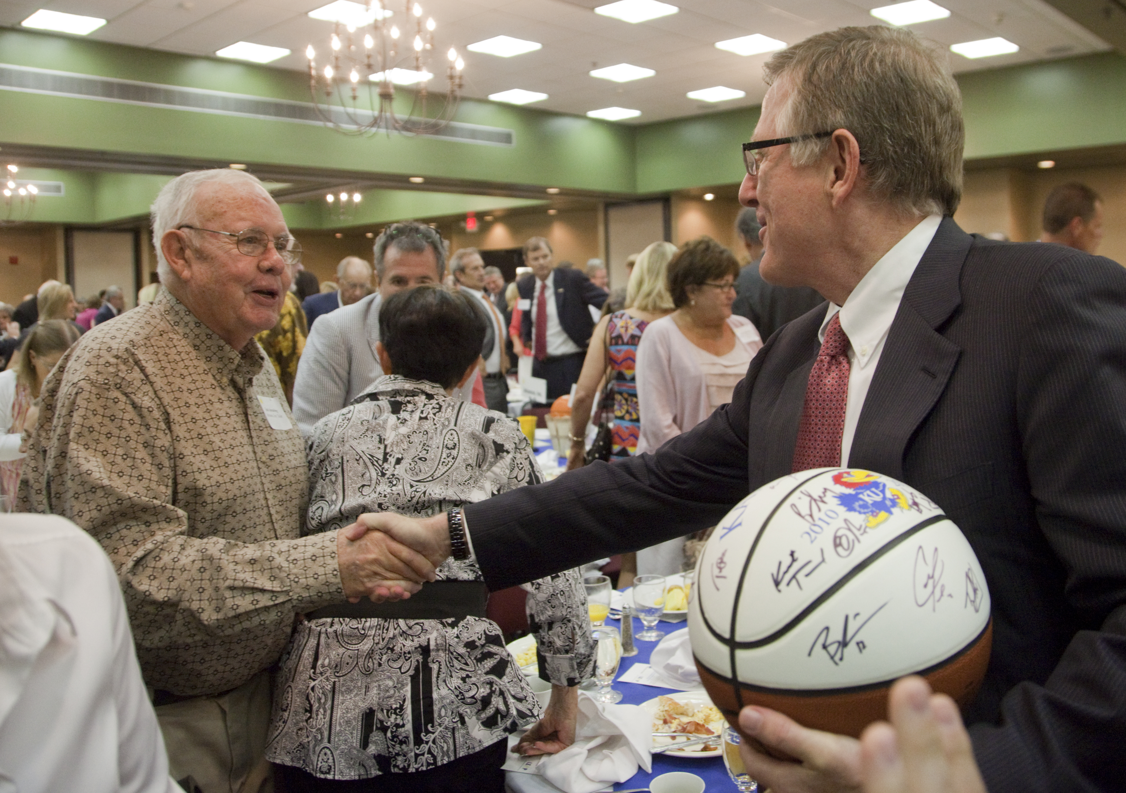 After being presented a signed 2010-2011 KU men's basketball, David Booth, chairman and CEO of Dimensional Fund Advisors, shakes hands with Jack Arensberg. Booth's first job was working for Jack at Arensbergs shoes. Booth, a 1964 LHS graduate and owner of the original rules of basketball, was the keynote speaker at the event.