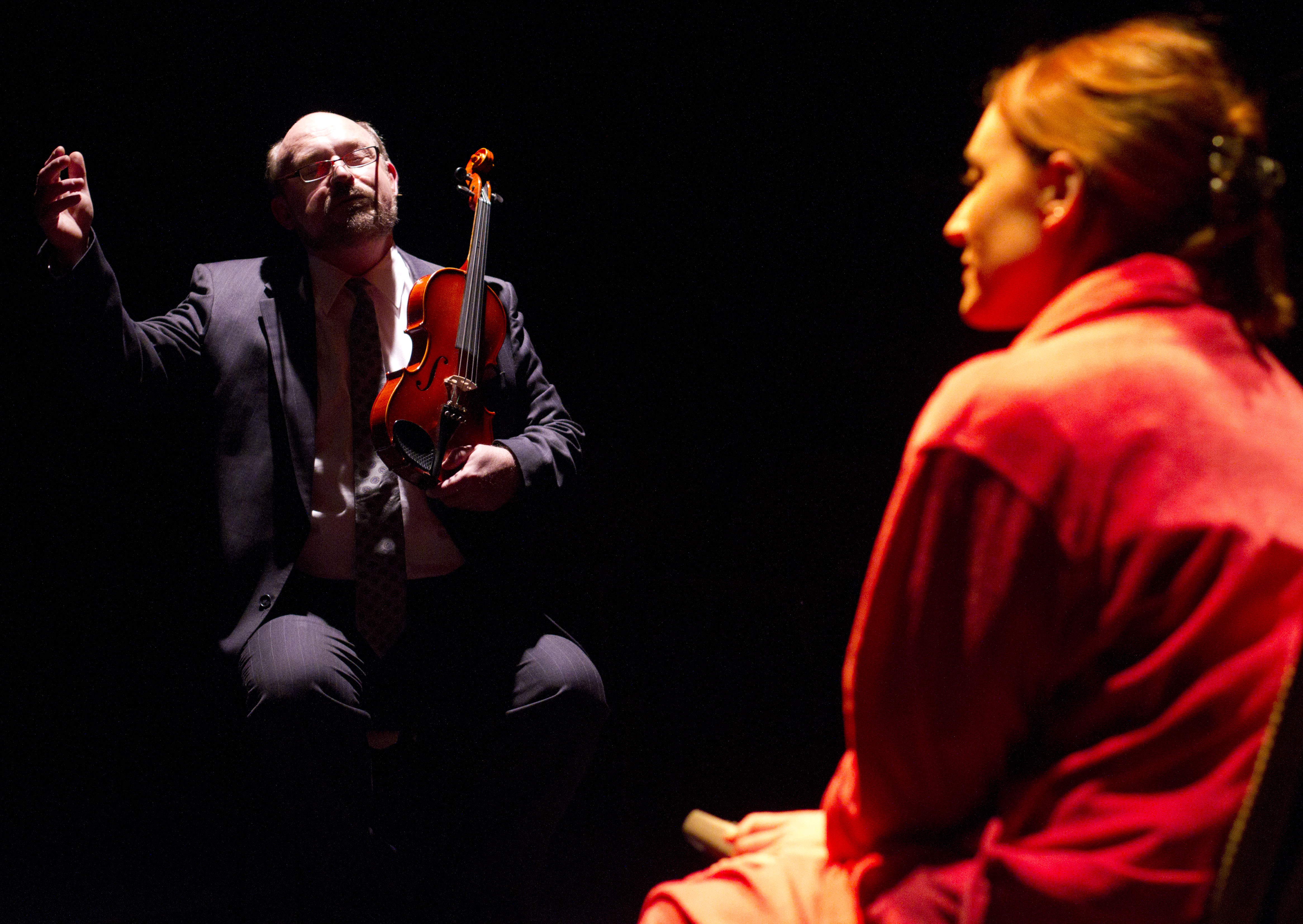 Charles Goolsby, left, and Liza Pehrson rehearse a scene from Opus. The play follows a world class string quartet that has just fired one of its members and is struggling to adjust to its talented new musician days before a televised performance at the White House.