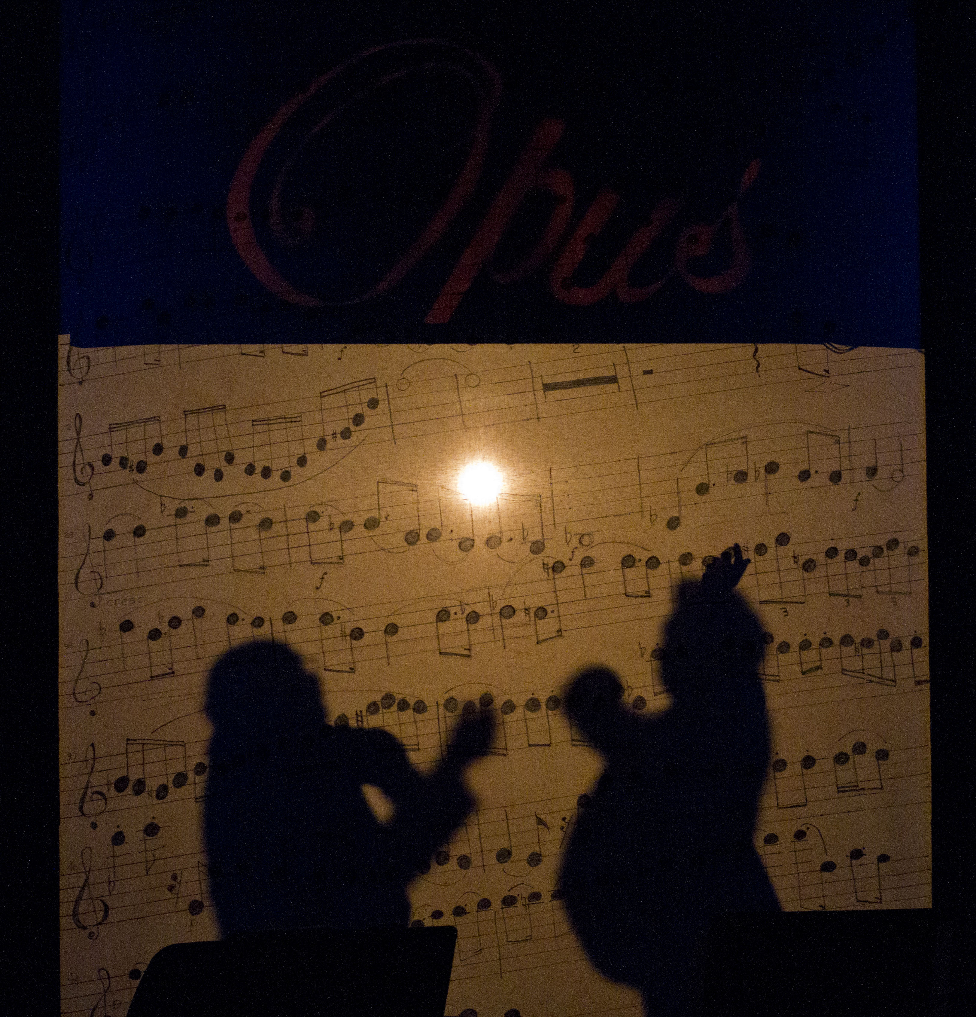 Thought the characters in Opus world class musicians, the actors understandably, are not. Director Doug Weaver brought in Steve Donaldson, executive director of the Lawrence Chamber Orchestra, to advise the actors and Richard Walker, music director for the Lawrence Art Center Voices choir, served as music director for the play.