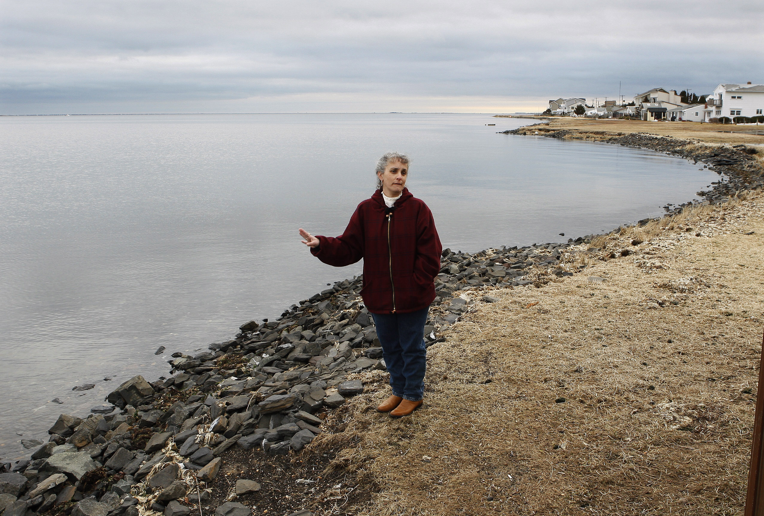 In this Feb. 24, 2010, picture, Regina Discenza stands on the shore of Barnegat Bay, near her home in Lacey Township, N.J., as she talks about the fears of water discharged from the nearby Oyster Creek nuclear plant. At the 41-year-old facility in southern New Jersey, the country's oldest operating reactor, the latest tritium troubles started in April 2009, a week after it was relicensed for 20 more years. None has been directly measured in drinking water, but it has been found in an aquifer and in a canal discharging into nearby Barnegat Bay. The bay is a popular spot for swimming, boating and fishing.