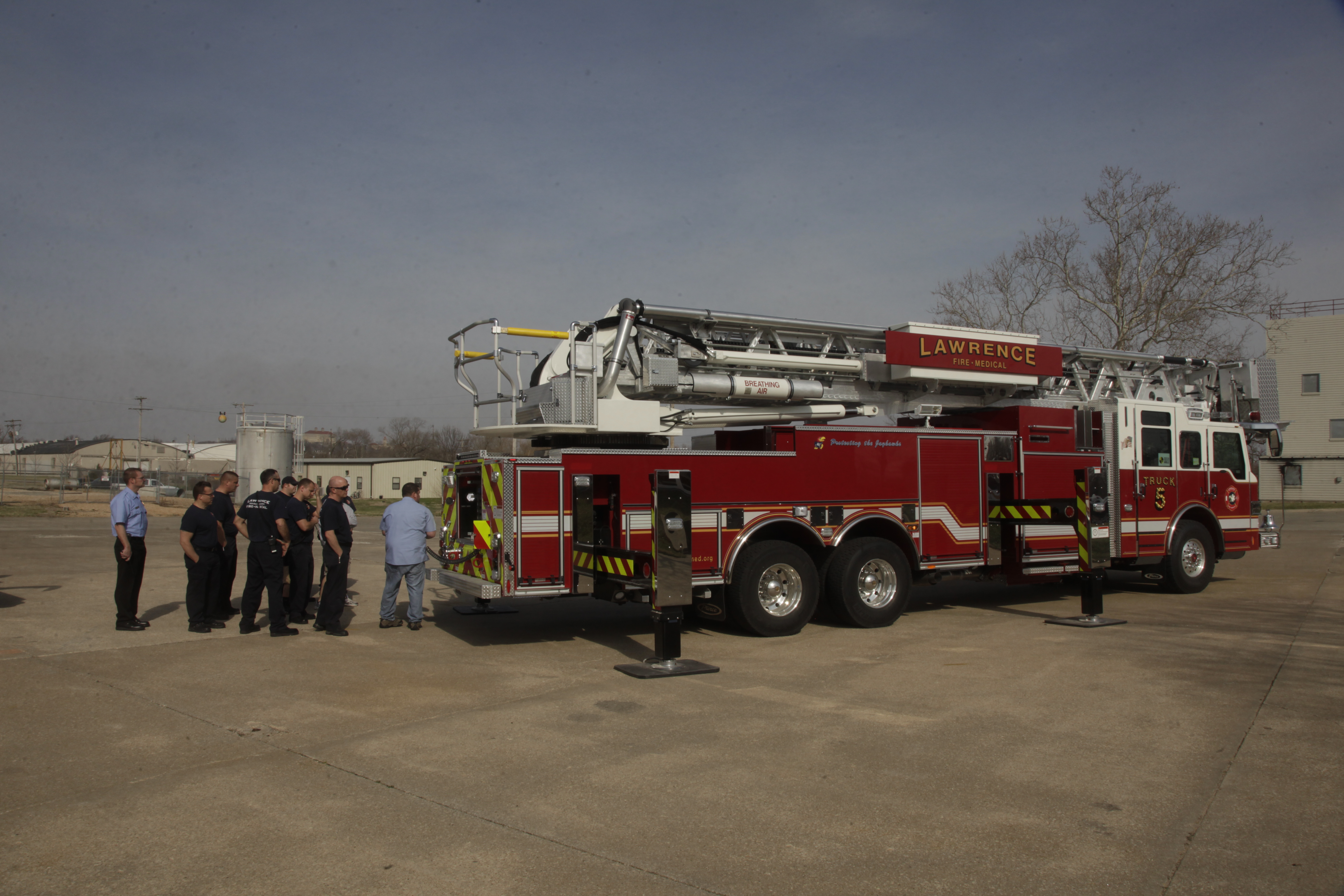 Lawrence fire fighters check out the city's newest fire apparatus, a 100' ladder, that arrived in Lawrence last week. The truck, which has a platform at the top to make fire fighting easier, replaces a ladder truck that was more than 20 years old.