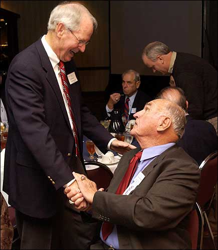 Former Kansas basketball coach Ted Owens, left, greets ex-KU player and coach Don Fambrough at a benefit dinner for the Bert Nash Center in this file photo from 2004. Fambrough died Saturday, Sept. 3, 2011 at 88.