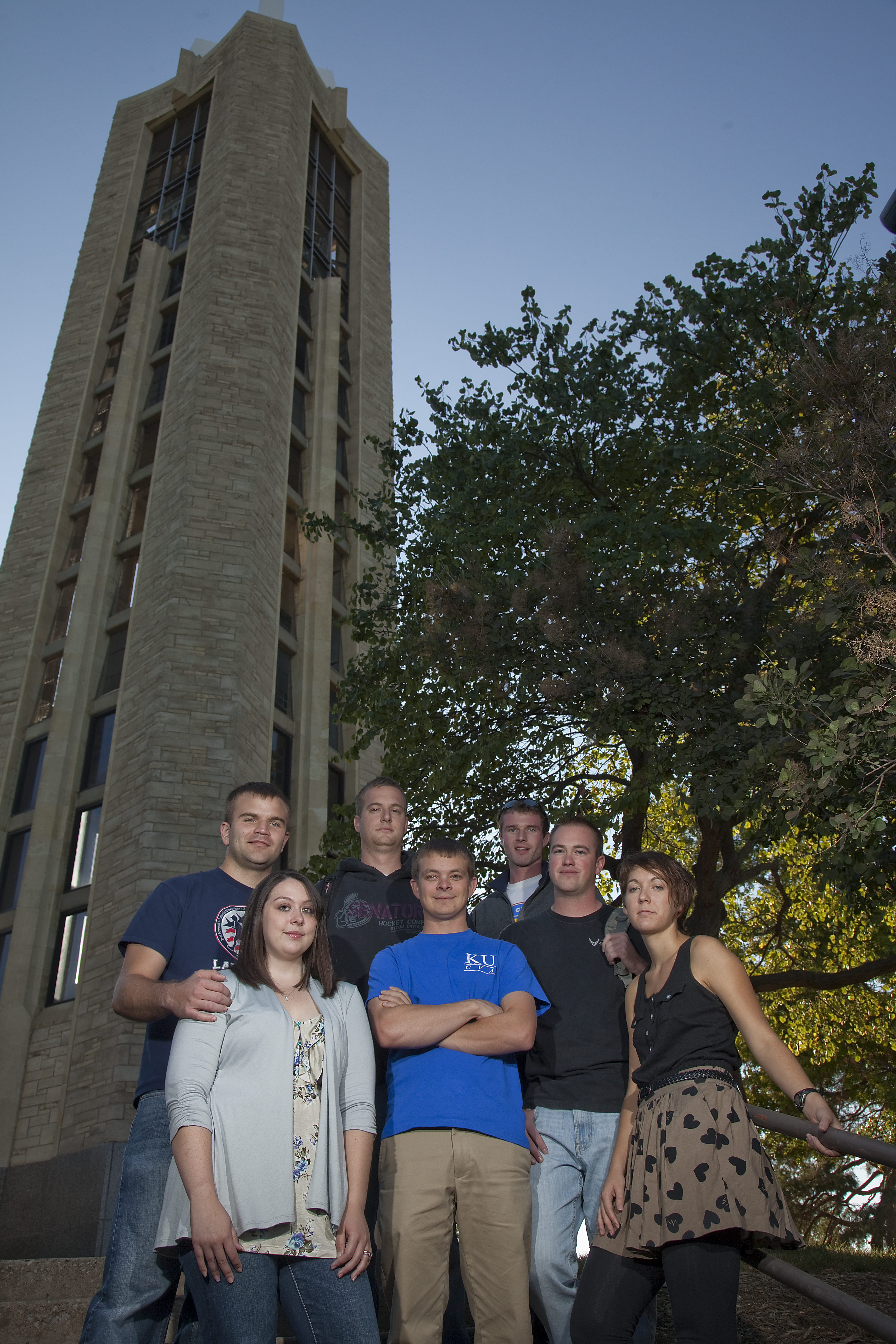 Many veterans coming back from Iraq or Afghanistan are choosing to go back to college to earn a degree instead of searching for a job in the down economy. Some of those veterans attending KU are, front row from left, Katherine Robinson, Andrew Foster, Kyle Brown and Sara Sneath; back row from left: Jake Robinson, Drew Beets and Stewart Melton.