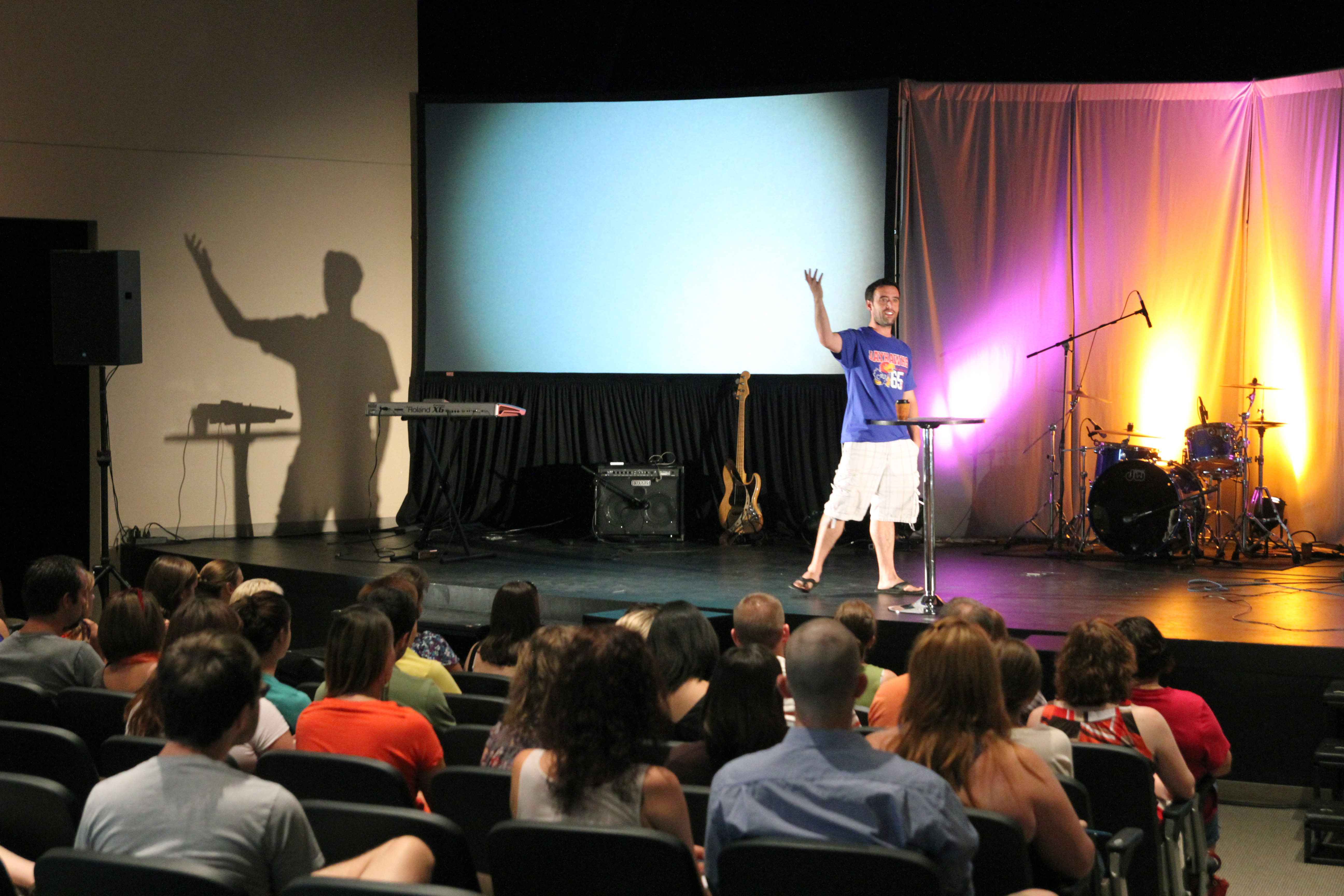 Pastor Matt Cox speaks during a July 29 EastLake Church service at South Middle School. The School auditorium was transformed into a sanctuary of sorts for the service. The church has been splitting time primarily between the school and the Lawrence Holiday Inn Convention Center, but members hope to find a permanent location.