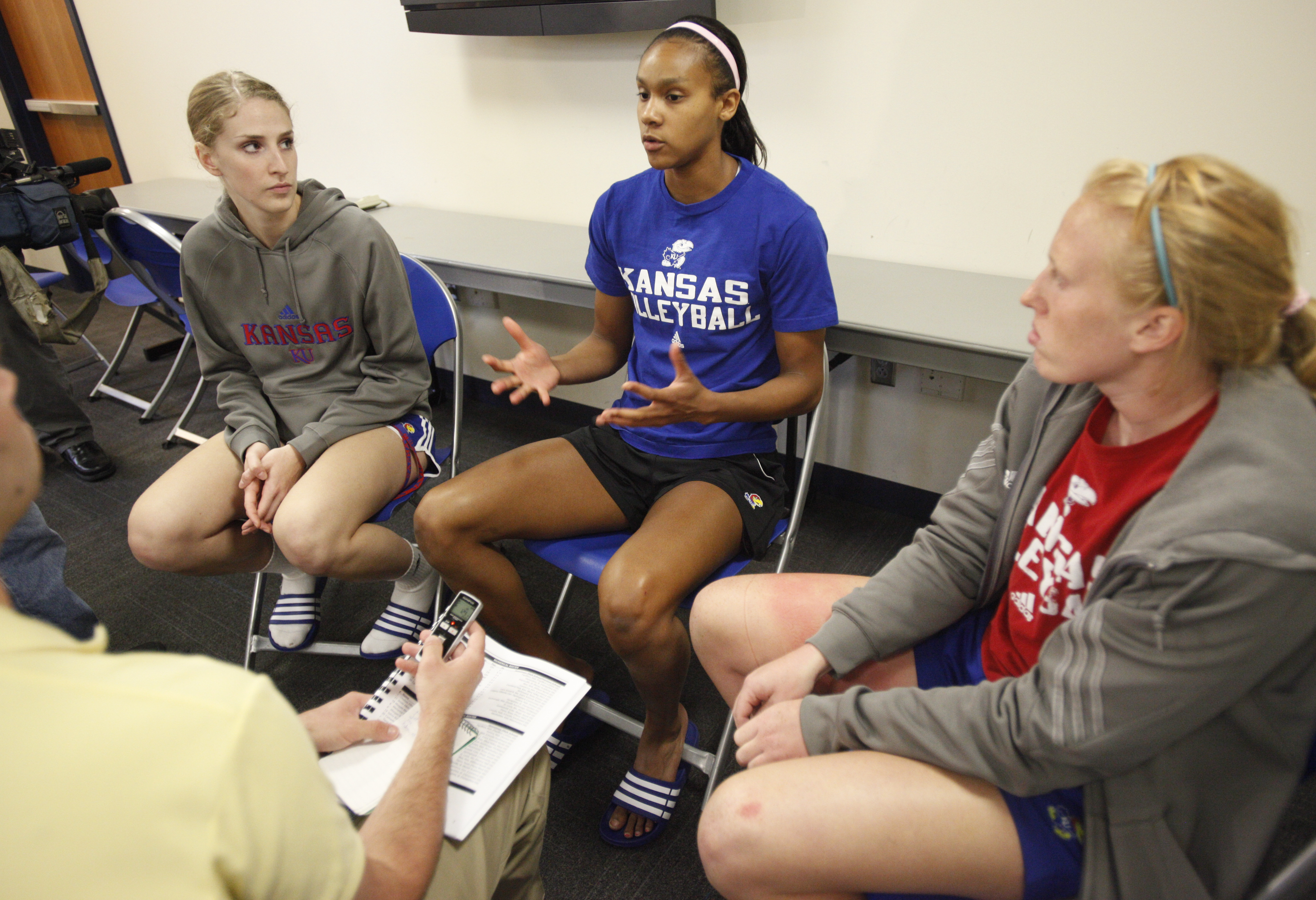 Kansas University volleyball players Caroline Jarmoc, left, Tayler Tolefree and Morgan Boub talk with media members during a fall sports media day at Allen Fieldhouse, Thursday, Aug. 16, 2012.