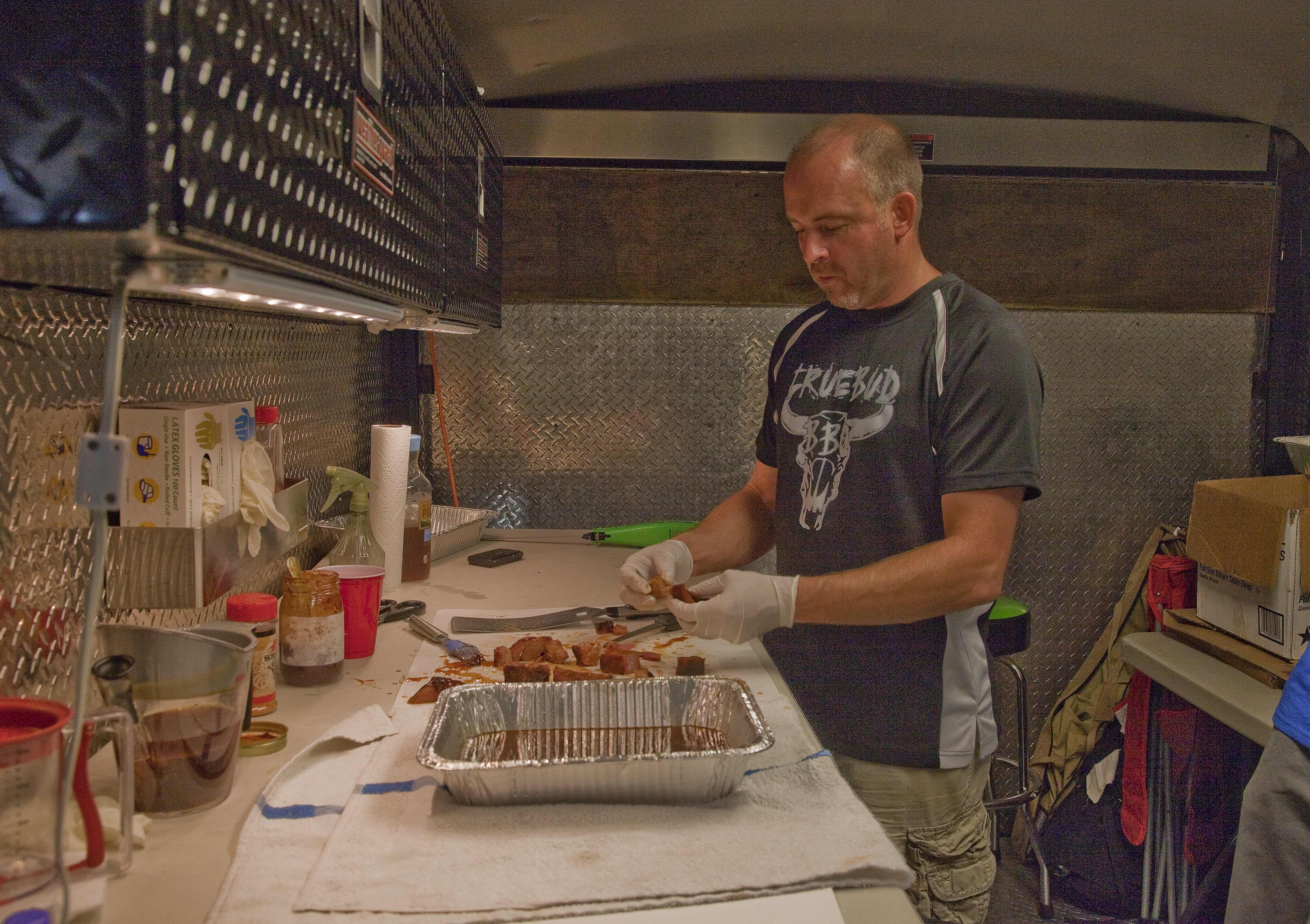 Inside the prep trailer it’s no picnic — it’s a barbecue emergency room.