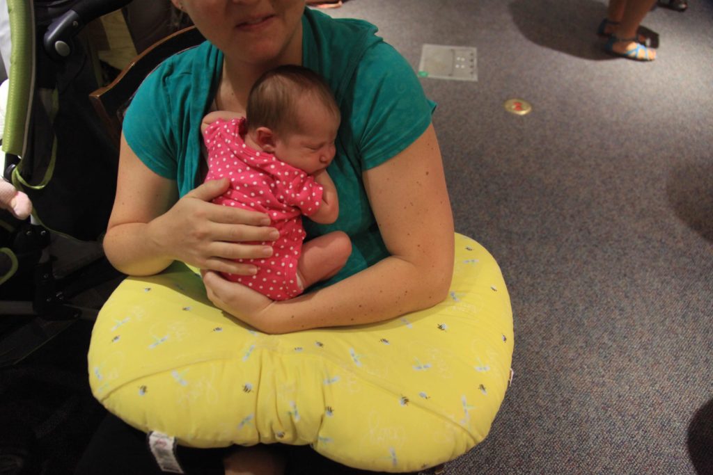 One-week-old Maggie Stultz, above, rests in her mother’s lap. Nursing a baby can be cumbersome, but moms and babies can get a boost with the help of a Boppy, a U-shaped pillow that slips around a mother’s waist and helps support the baby.