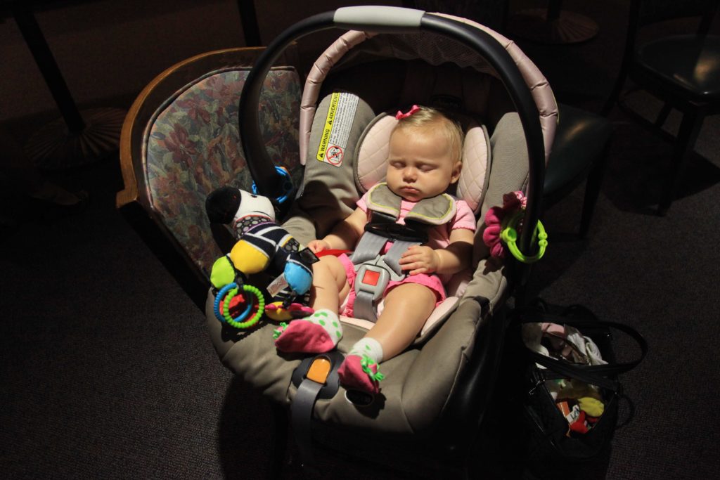 Ella Cate Vise, 4 months, sits in her carrier complete with an array of toys to plays with last week at a support group for new mothers at Lawrence Memorial Hospital. A car seat is a necessity, but use care when looking at after-market additions.