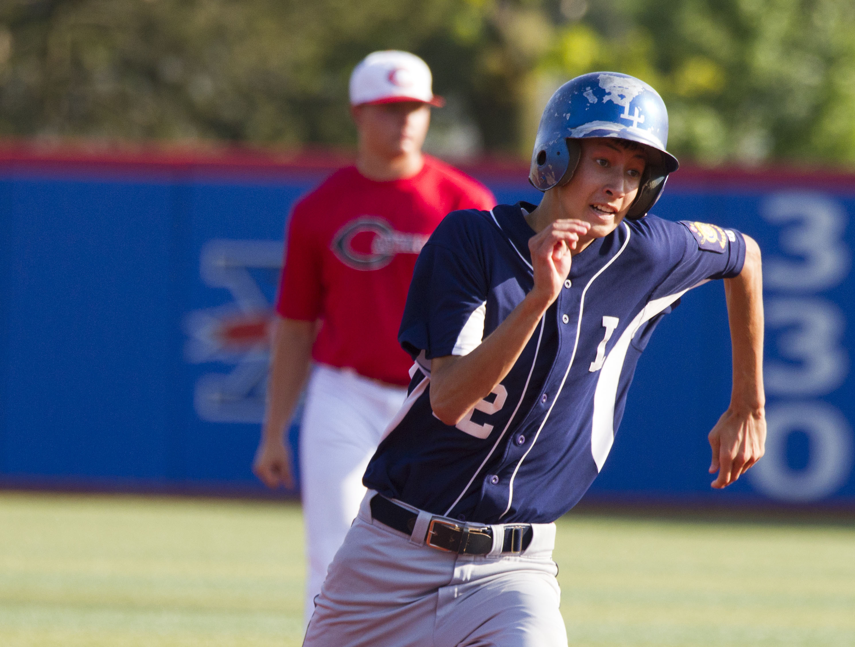 Lawrence Raiders baserunner John Fellers rounds second and heads toward third during a game against Topeka on Sunday, June 24, 2012, at Hoglund Ballpark.