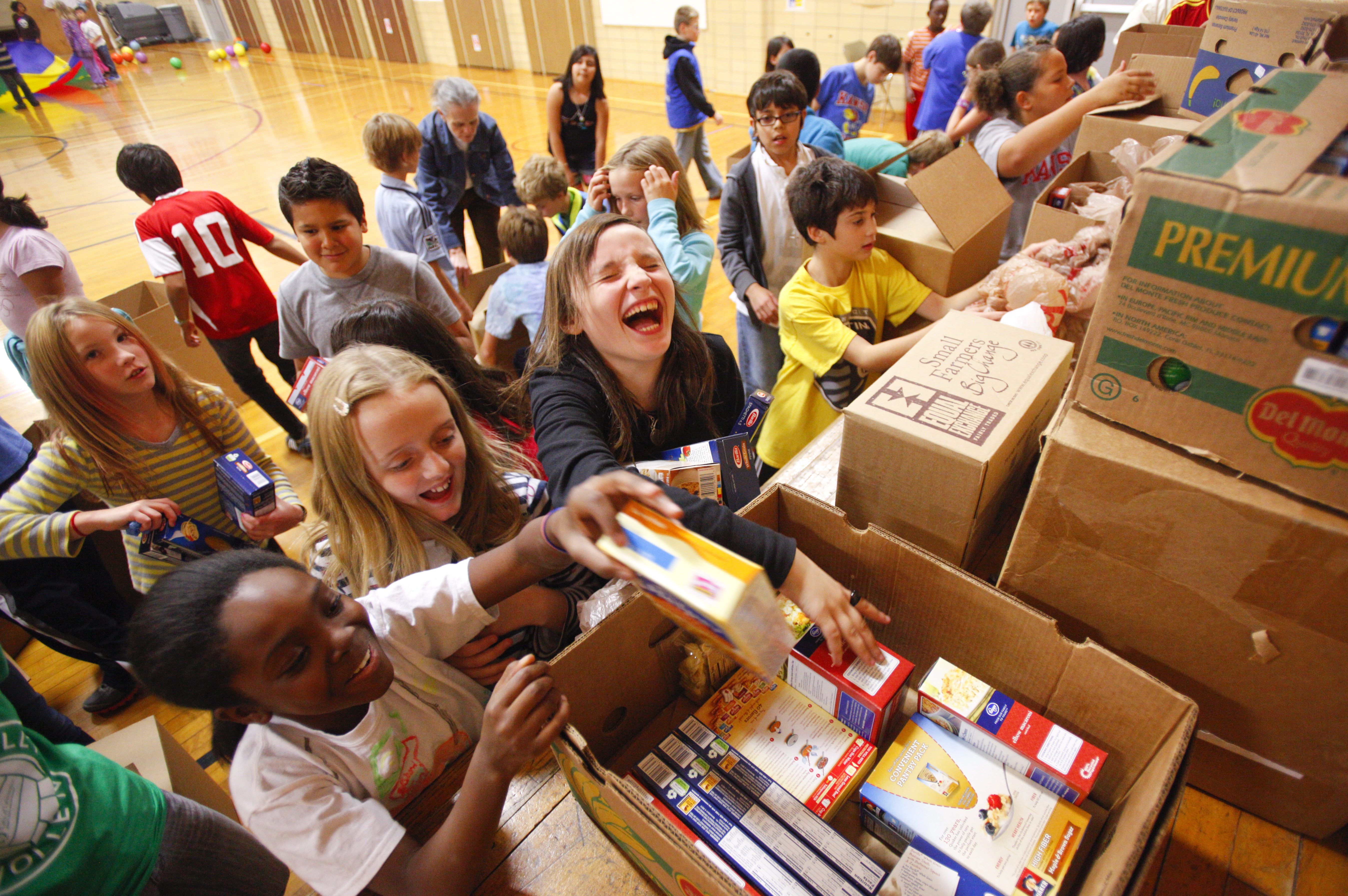 Cordley School fifth-graders Chloe McNair, bottom left, Harper Kalar-Salisbury and Raegan Teenor laugh as they reach for the same package while trying to organize boxes for a food drive Thursday, Oct. 18, 2012. Seventy-one boxes of nonperishables were collected and given to representatives of the Cornerstone Southern Baptist Church food pantry, which provides needy children with back-snack foods to take home on the weekends.
