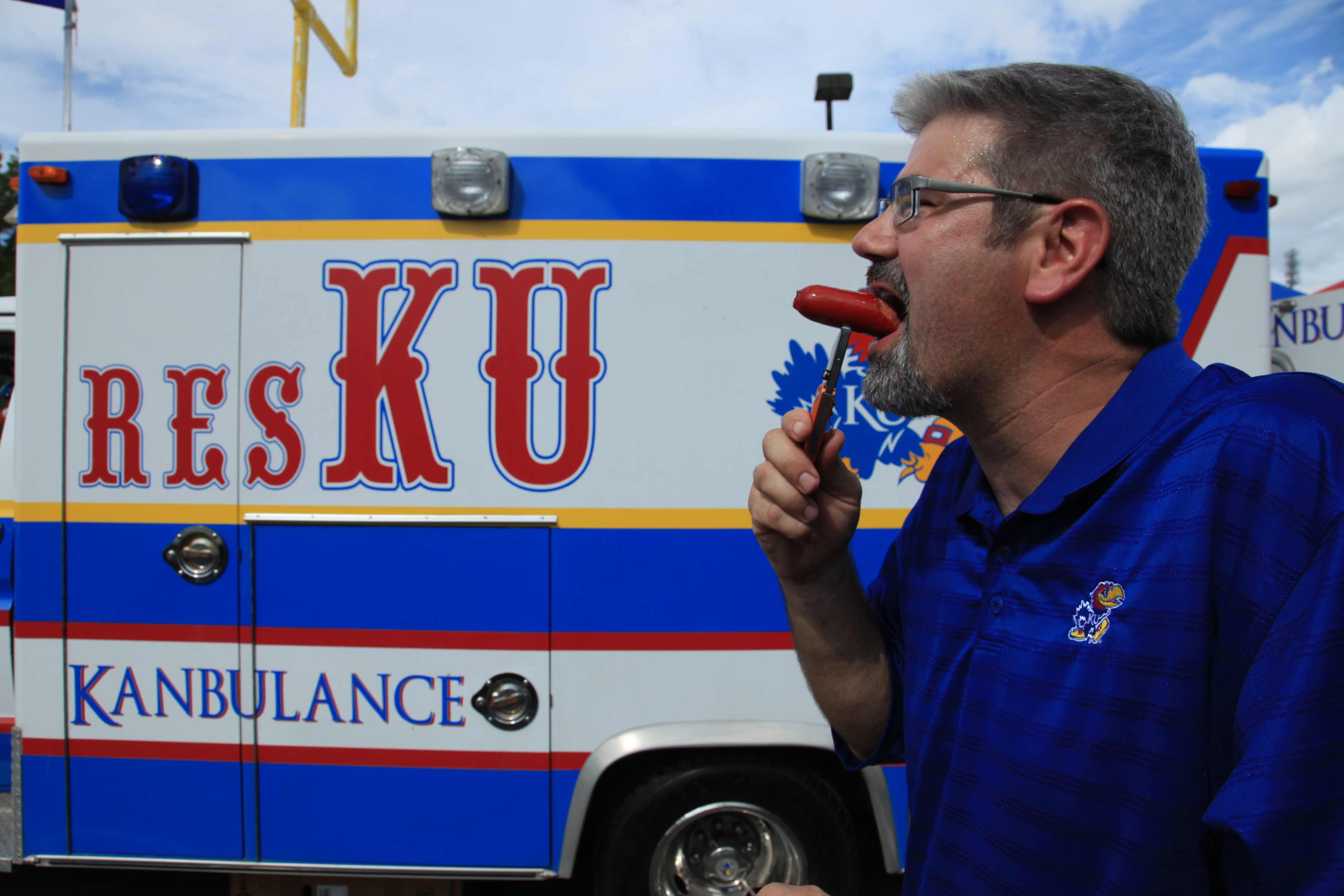 Kanbulance tailgater Wes Smith takes a bite of a spicy dog at the Kansas University football team's 2012 home opener against South Dakota State University.