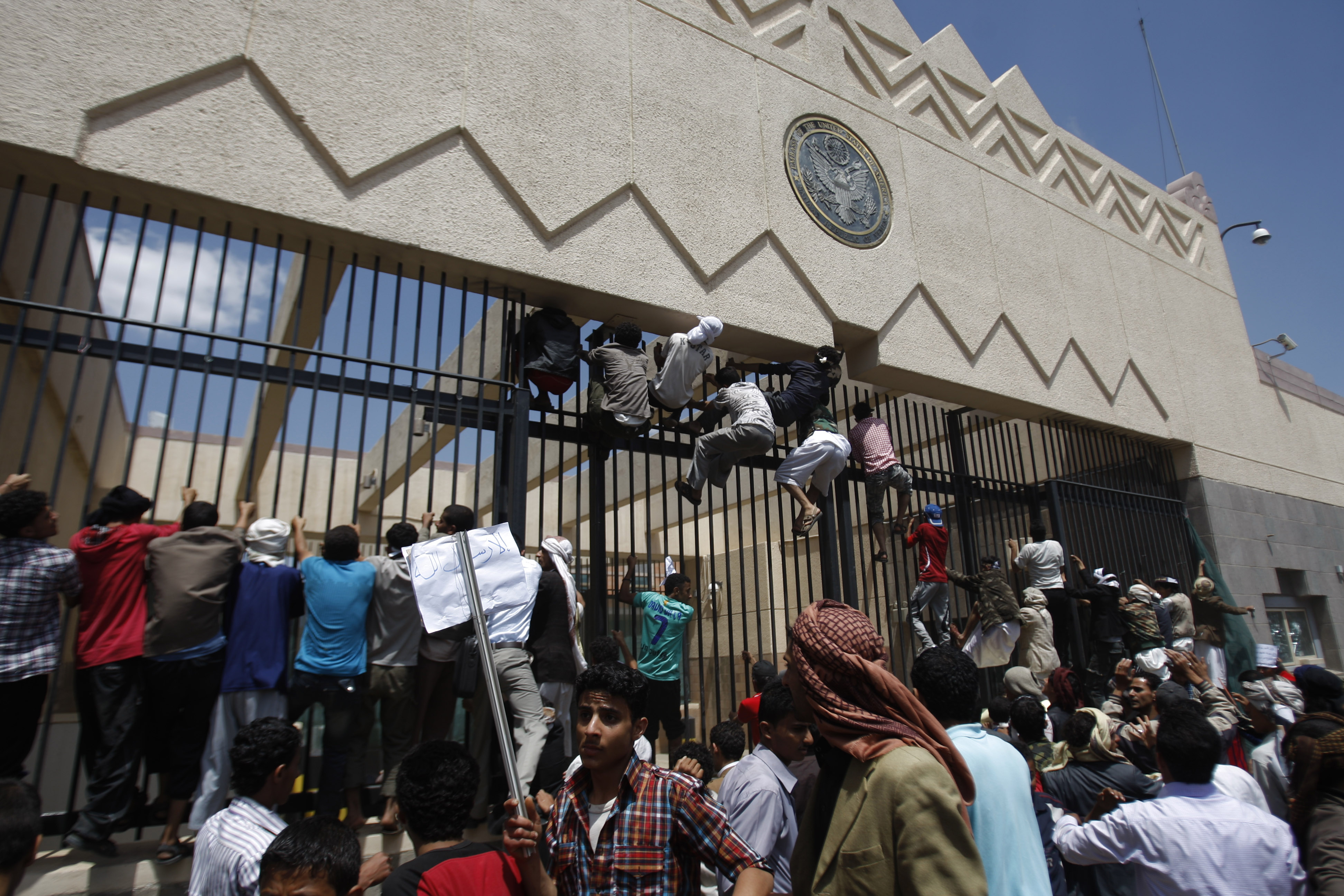 Yemeni protesters climb the gate of the U.S. Embassy during a protest about a film ridiculing Islam's Prophet Muhammad, in Sanaa, Yemen, Thursday, Sept. 13, 2012. Dozens of protesters gather in front of the US Embassy in Sanaa to protest against the American film The