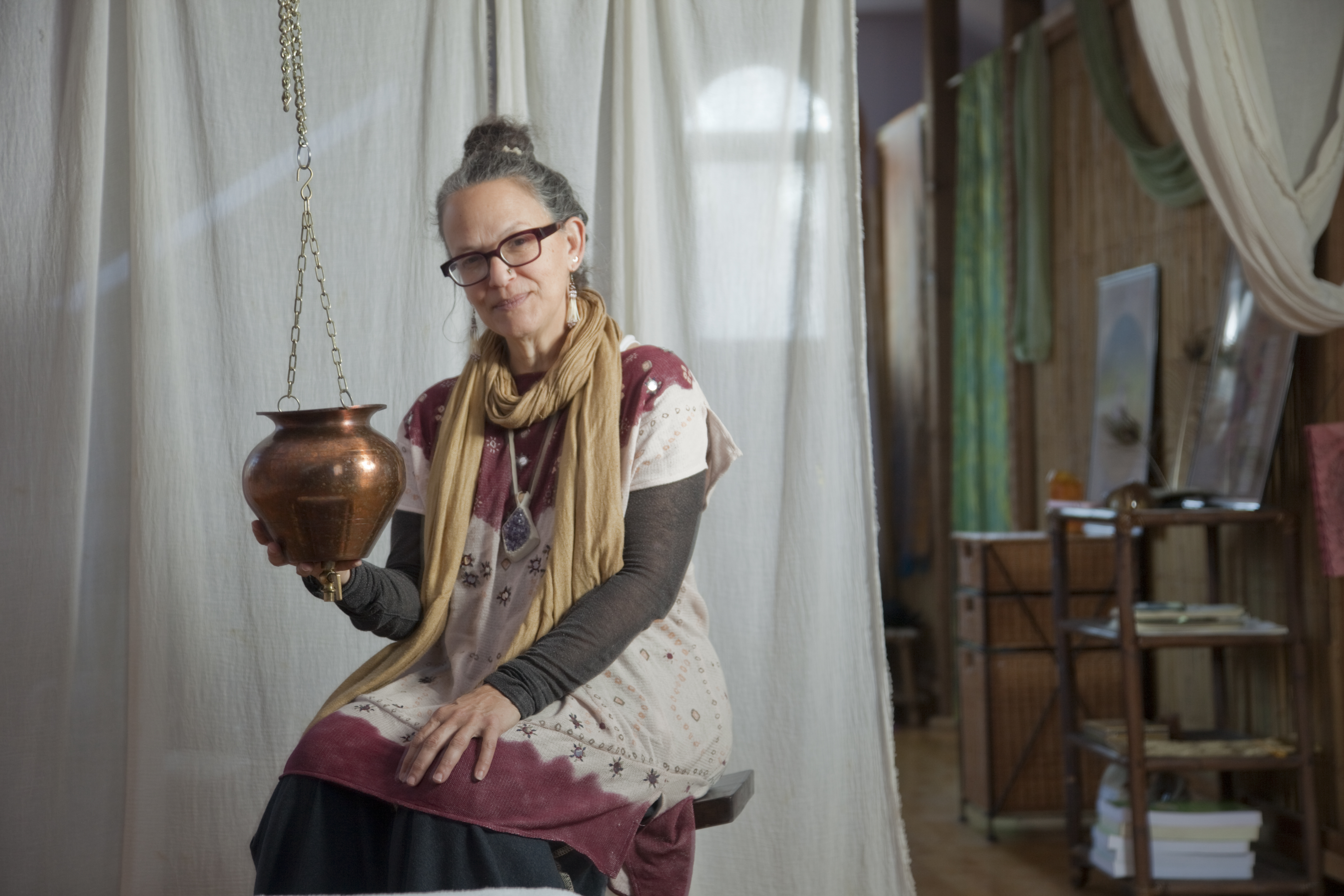Laura Martin-Eagle practices Ayurveda restorative therapies, ancient Indian therapies that find imbalances in the body. Martin-Eagle, shown in her studio, with a hanging metal pot used for the Shirodhara practice.