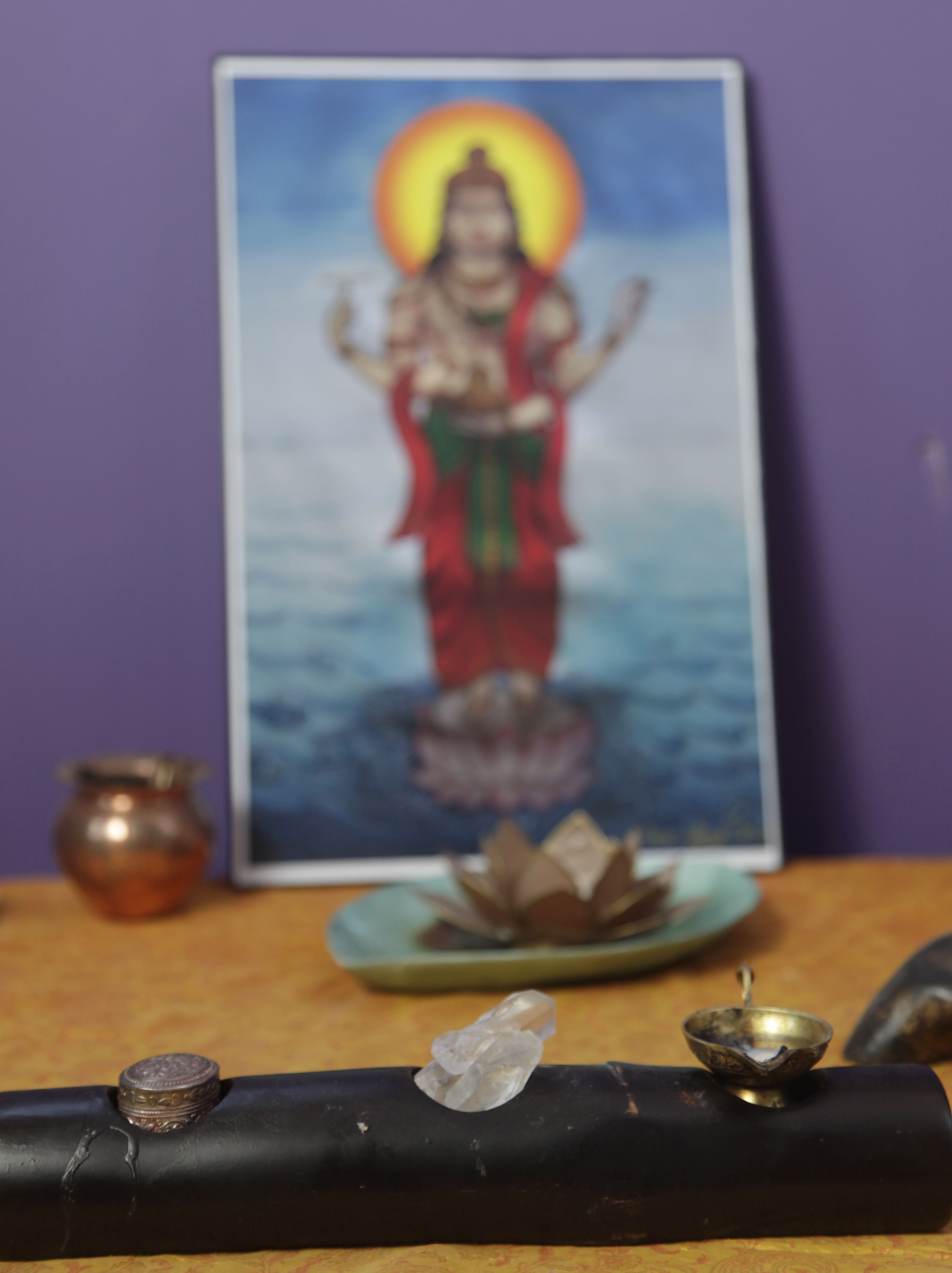 An altar with the image of Lord Dhanvantari, the god of health care and regarded as the source of Ayurveda, is displayed inside the studio space of Ayurveda practitioner Laura Martin-Eagles studio.