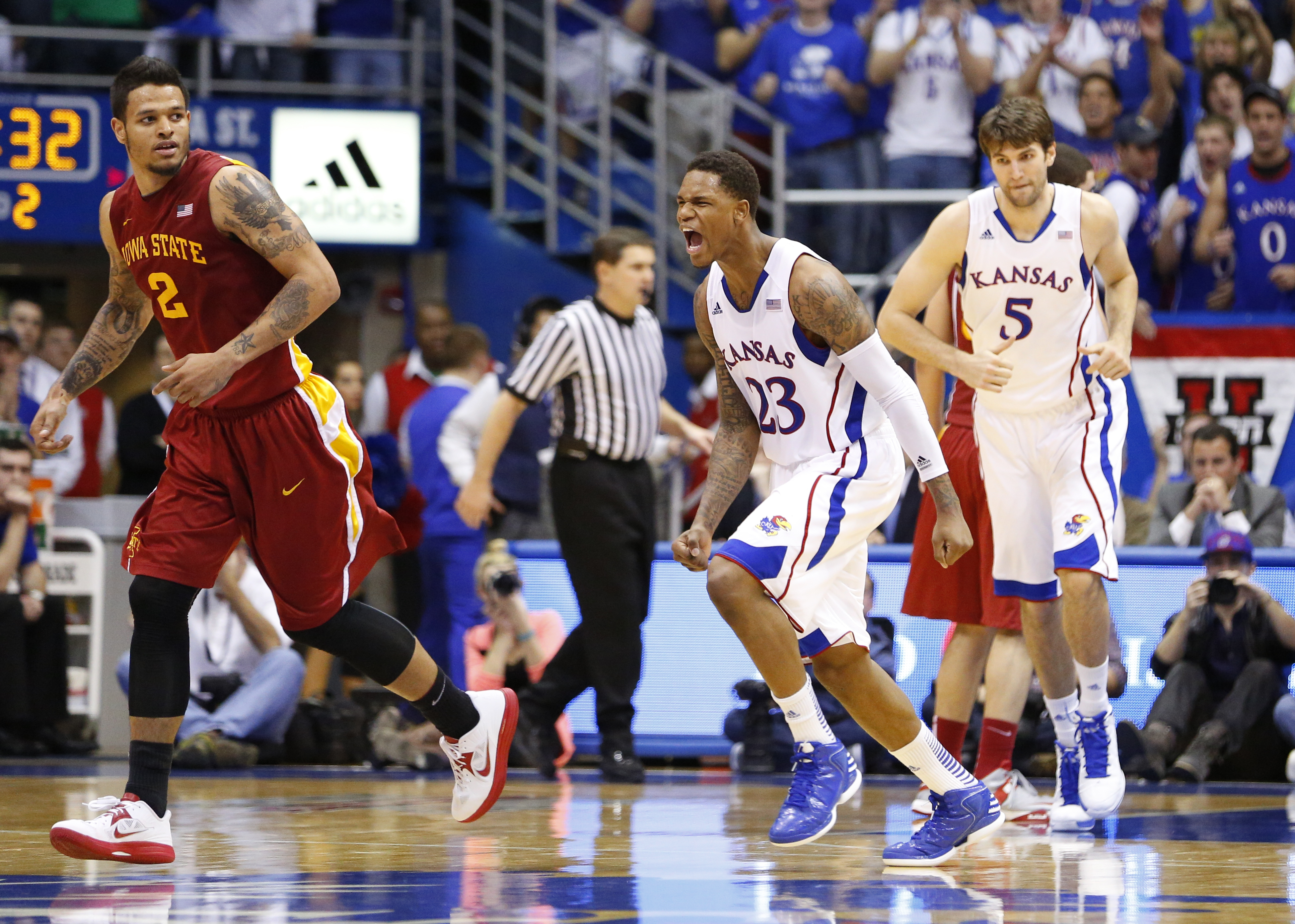 Kansas guard Ben McLemore celebrates a bucket next to Iowa State guard Chris Babb as the Jayhawks make a run during the second half on Wednesday, Jan. 9, 2013 at Allen Fieldhouse.