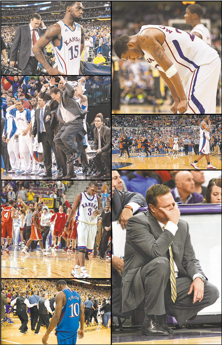 Scenes from some of the worst losses in the Bill Self era (we know it hurts): clockwise from top left, Self and Elijah Johnson (15) after a 2013 NCAA Tournament loss to Michigan; Marcus Morris hanging his head late in a tourney setback to Virginia Commonwealth in 2011; Bucknell players swarming the court after a first-round upset of KU in the 2005 NCAAs; Self unable to watch an unexpected loss at TCU five months ago; Tyshawn Taylor dejected after a regular-season loss at Missouri in 2012; Russell Robinson (3) getting out of the way of celebrating Bradley players after KU’s first-round ouster from the NCAAs in 2006; and Self showing off his vertical in a second-round loss to Northern Iowa in 2010.
