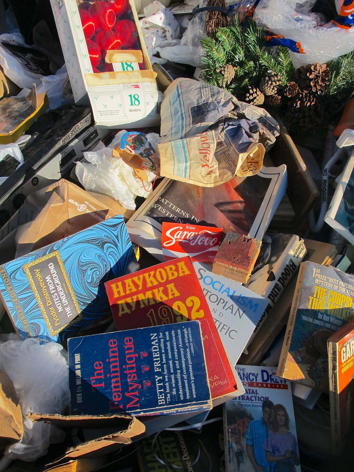 Christmas ornaments, a wreath and a variety of books were among items in David Loewenstein's Dec. 29 inventory of the trash bin behind the Social Service League Thrift Store, 905 Rhode Island St. His project documenting the mini-economy and community that's cropped up around the bin is called Give