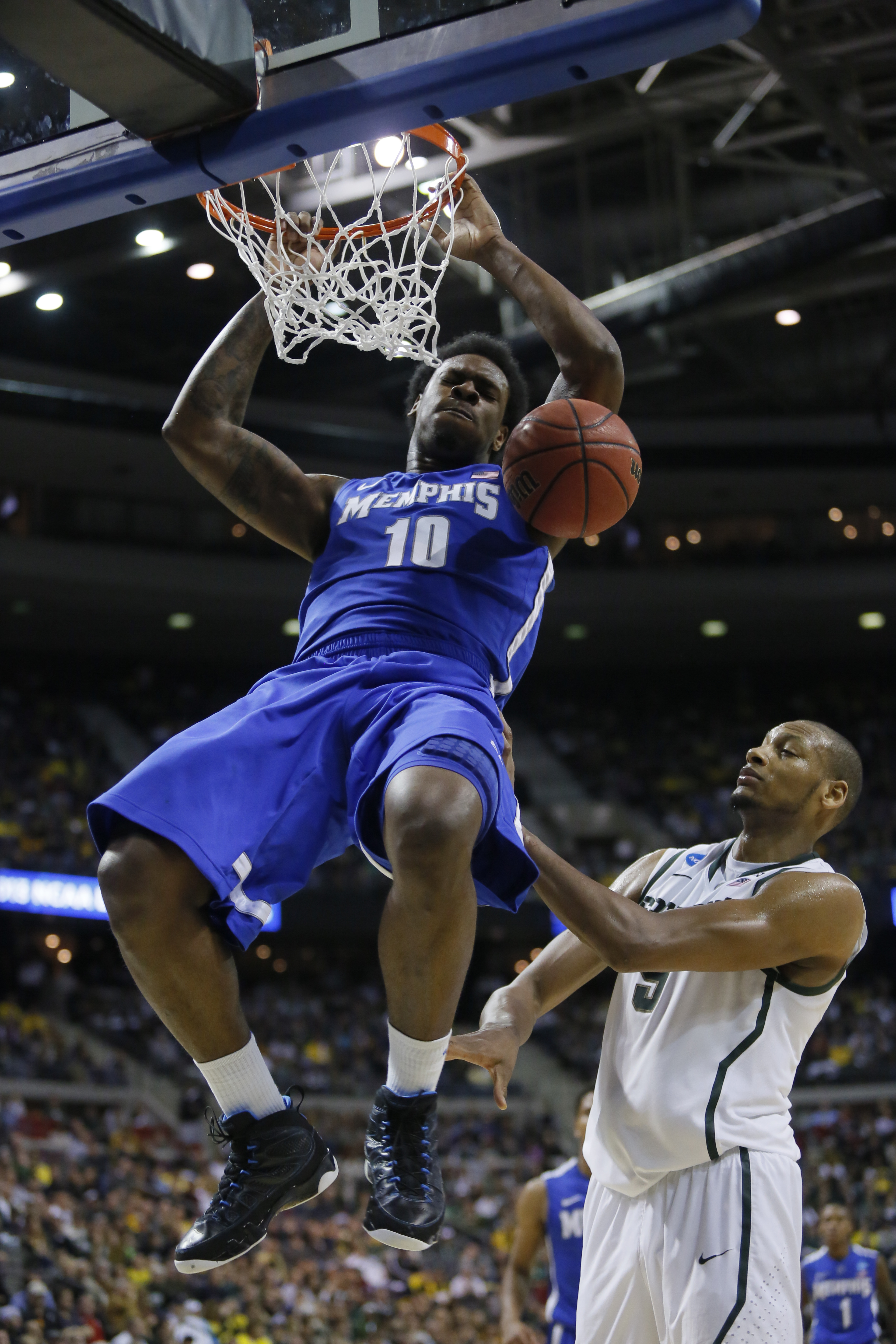 Memphis forward Tarik Black dunks against Michigan State forward Adreian Payne (5) in the second half of a third-round game of the NCAA college basketball tournament Saturday, March 23, 2013, in Auburn Hills, Mich.