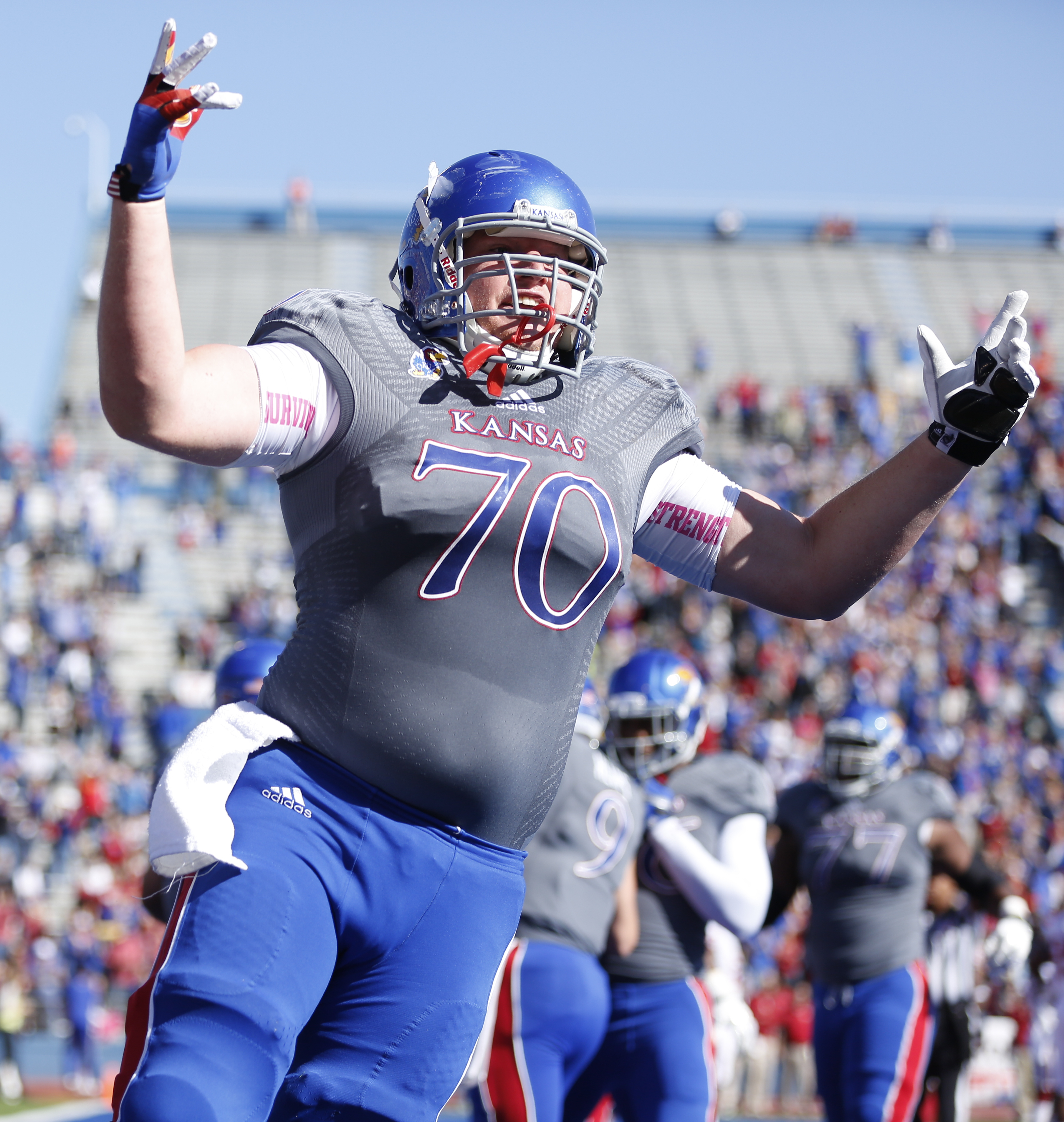 Kansas offensive lineman Gavin Howard raises up the crowd after tight end Jimmay Mundine's touchdown against Oklahoma during the first quarter on Saturday, Oct. 19, 2013 at Memorial Stadium.