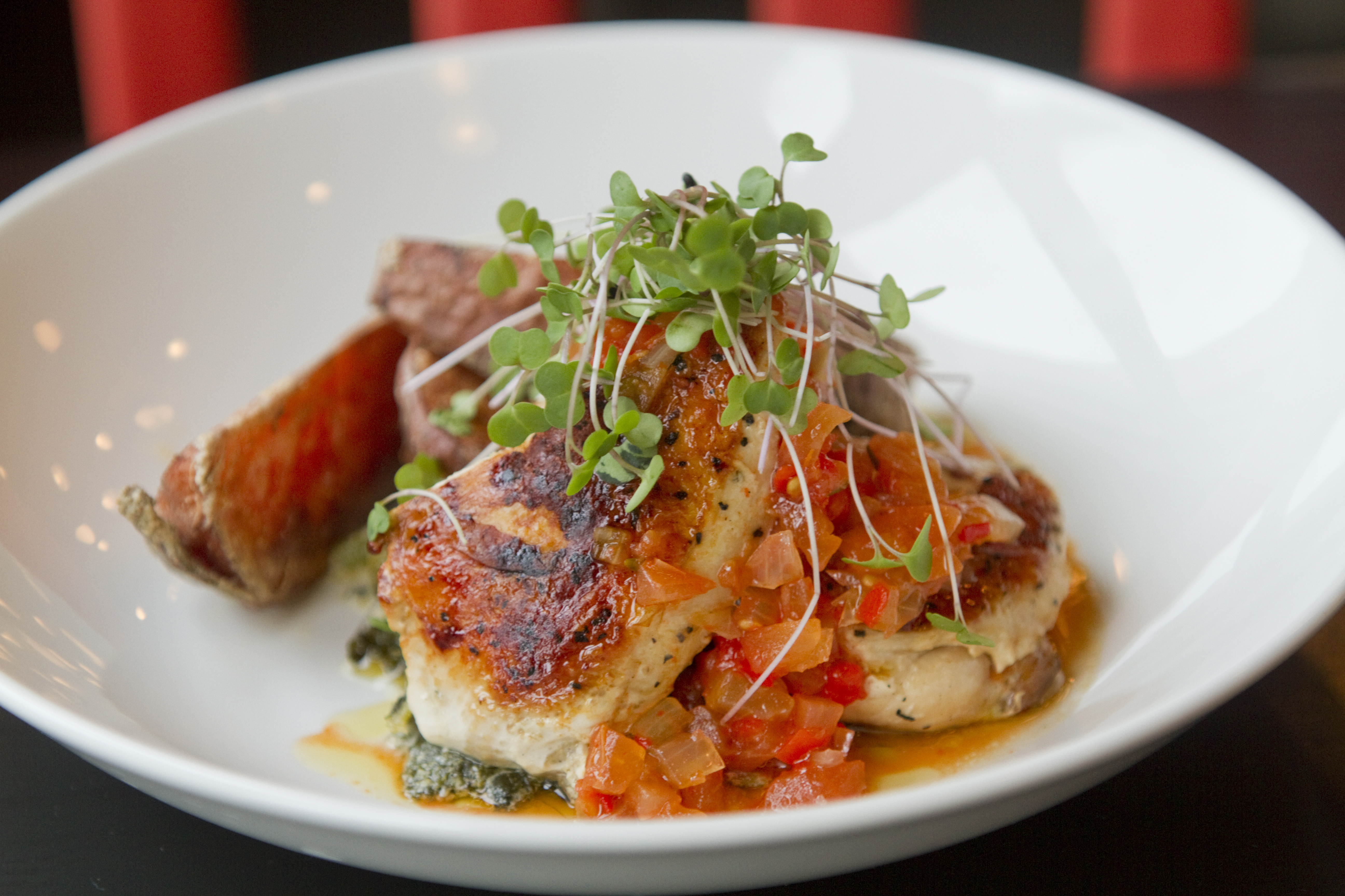 The Sweetlove Farm Chicken — served with creamed greens, yam fries and tomato-peppadew jam — at Merchants Pub & Plate, 746 Massachusetts St.