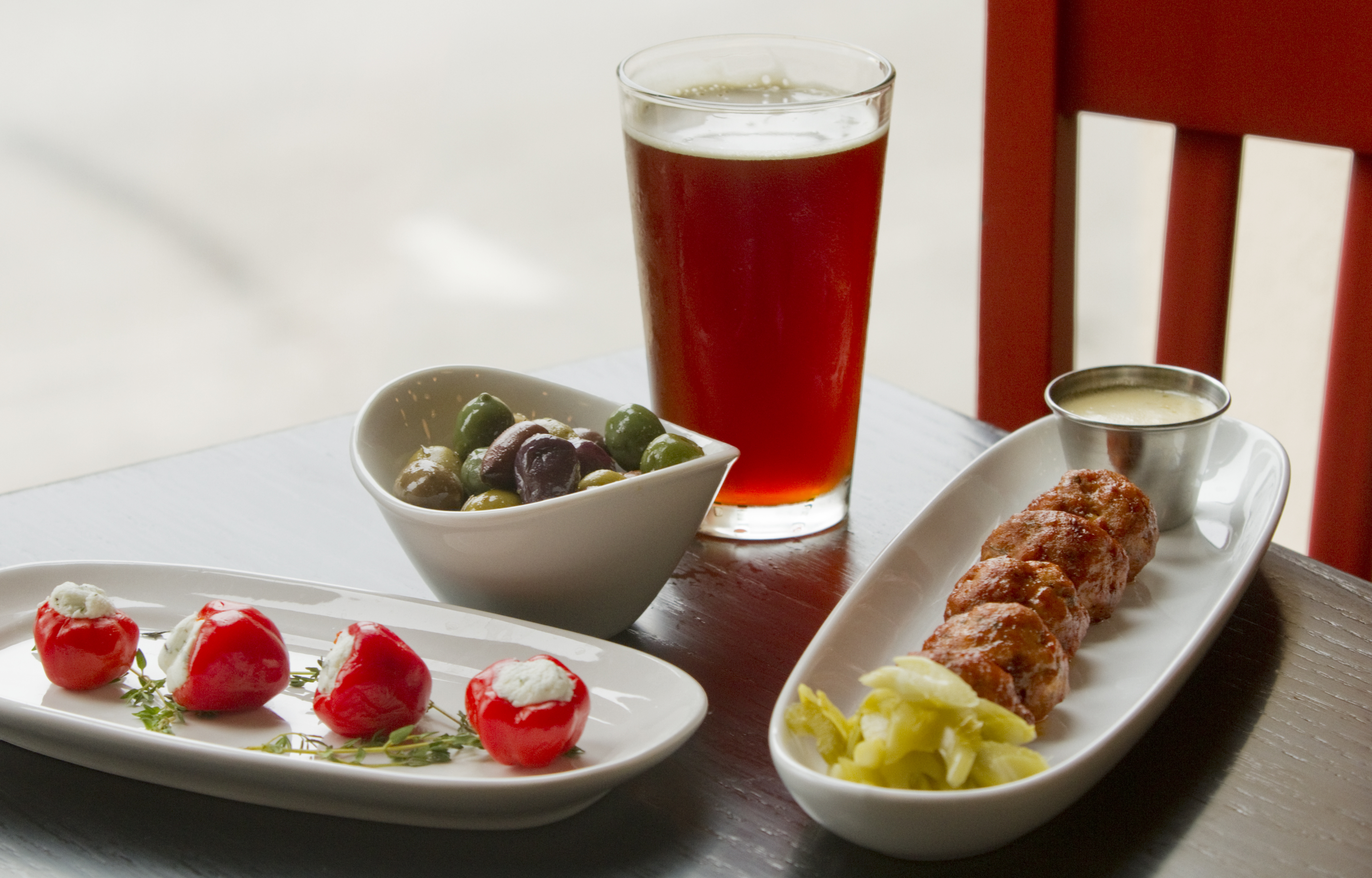 The bar snacks menu at Merchants Pub & Plate, 746 Massachusetts St., includes, from left, Pickled Peppers (sweet peppadews filled with candied cashews and herbed goat cheese), House Marinated Olives and Buffalo Chicken Meatballs (tossed in wing sauce and served with Boursin cream). They're pictured with a glass of Green Flash Imperial Red Rye.