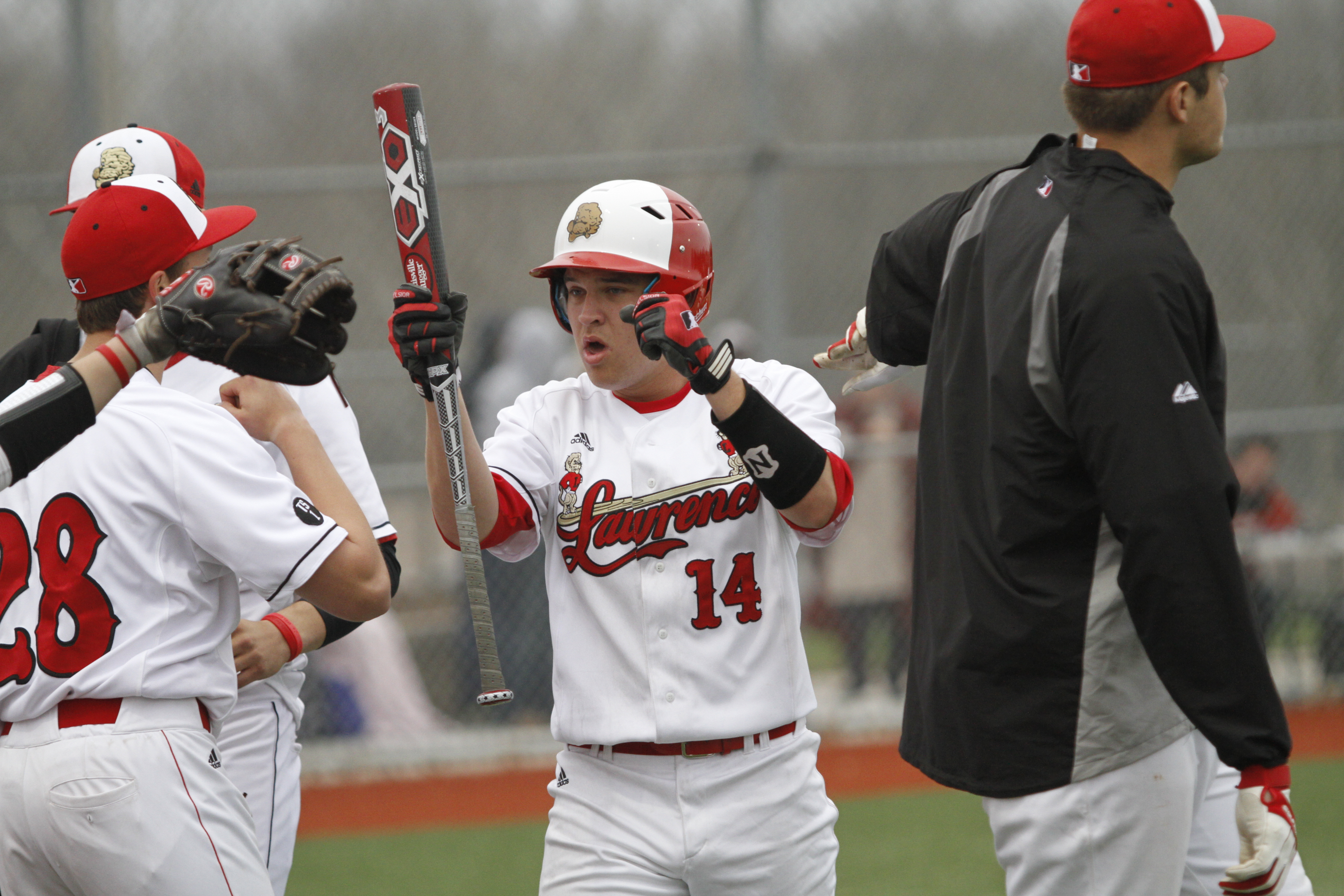 Lawrence High junior Michael Sinks (14) heads to the dugout after scoring a run off a third-inning, two-run double by teammate Ryan Walter in the Lions' home baseball game against Shawnee Mission West on Thursday, April 3, 2014, at LHS..