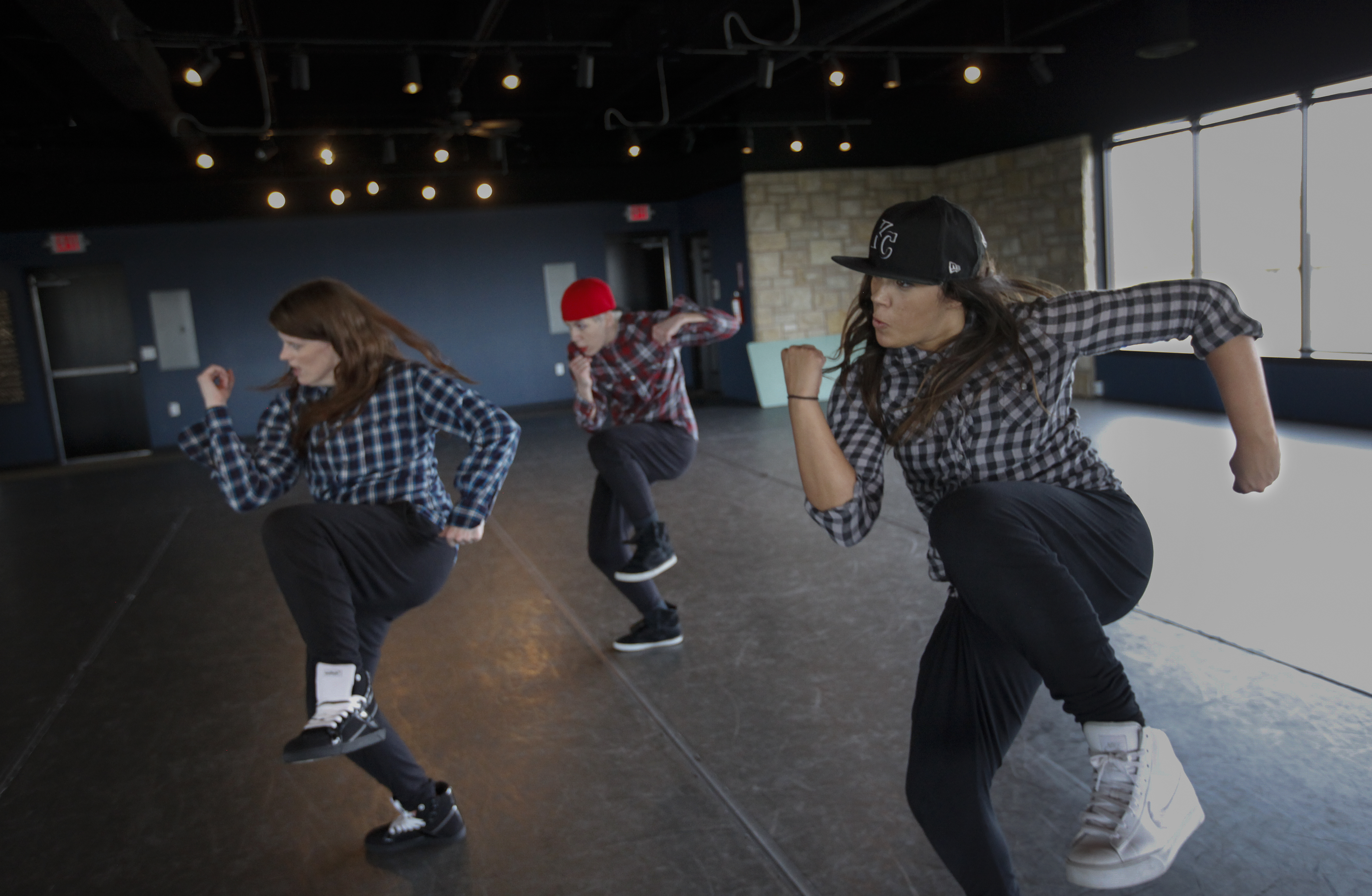 Dancers Blair Armstrong, front right, Deena Schaumburg, front left, and choreographer Carly Malsom perform during a rehearsal for the Point B Dance Carnival on Wednesday, April 23, 2014 at Point B Studio. The group will be performing at the Lawrence Arts Center on May 2nd and 3rd.