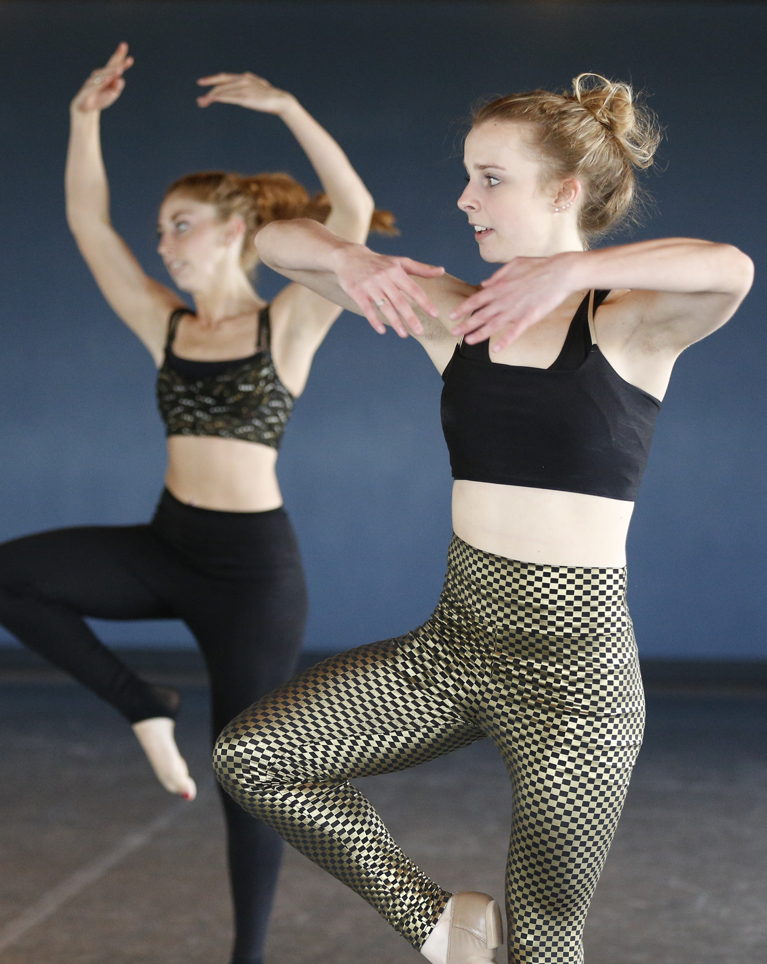 Jazz dancers Allie Howland, front, and Hannah Atwell perform during a rehearsal for the Point B Dance Carnival on Wednesday, April 23, 2014 at Point B Studio, 3300 Bob Billings Parkway. The group will be performing at the Lawrence Arts Center on May 2nd and 3rd. The show will combine both hip-hop and jazz choreography. Nick Krug/Journal-World Photo