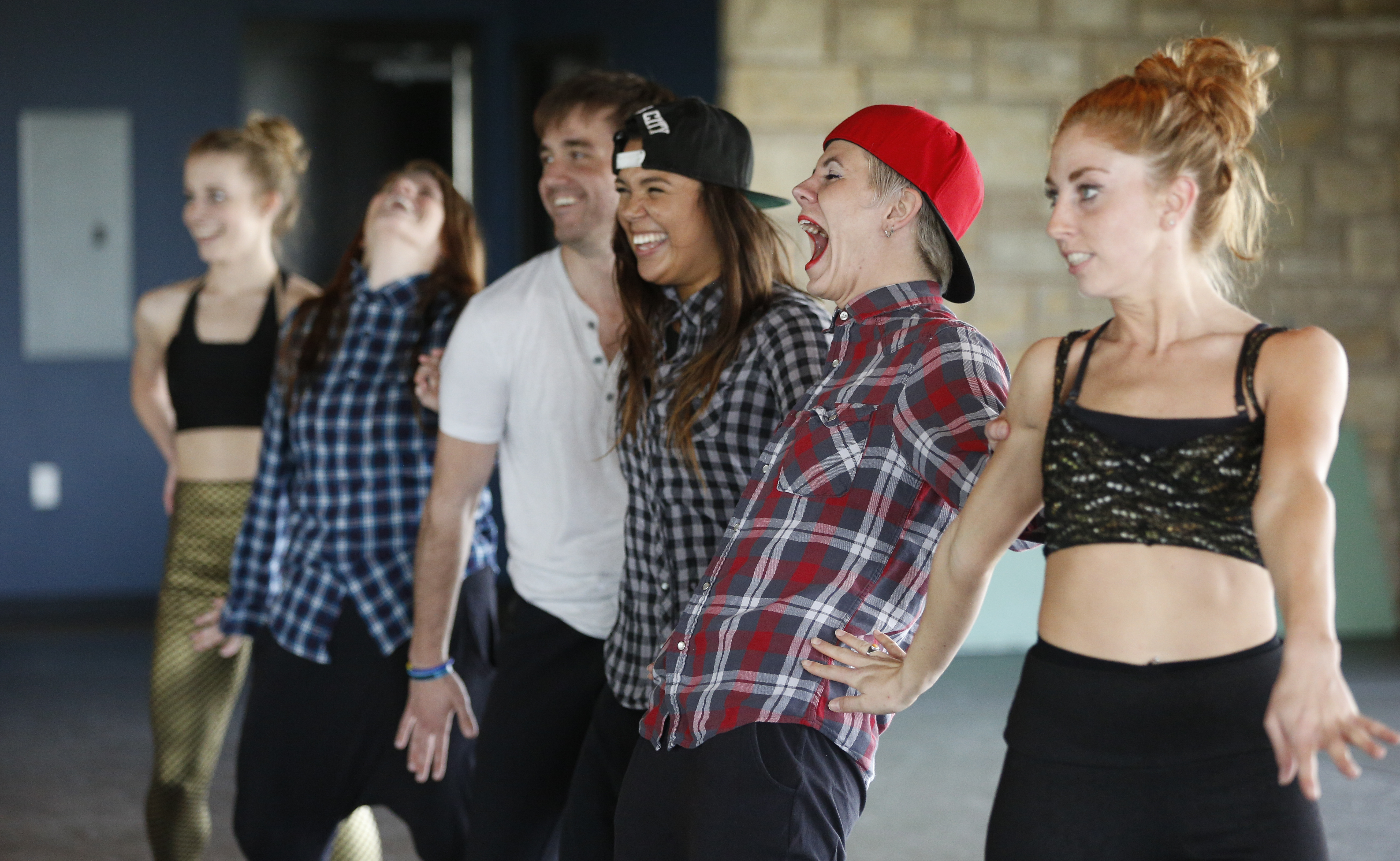 Choreographer Carly Malsom, second from right, laughs as she and other members of the Point B dance group work through kinks during a rehearsal for the Point B Dance Carnival. Also pictured with Malsom are Allie Howland, far left, Deena Schaumburg, Austin Roberson, Blair Armstrong and Hannah Atwell, right.