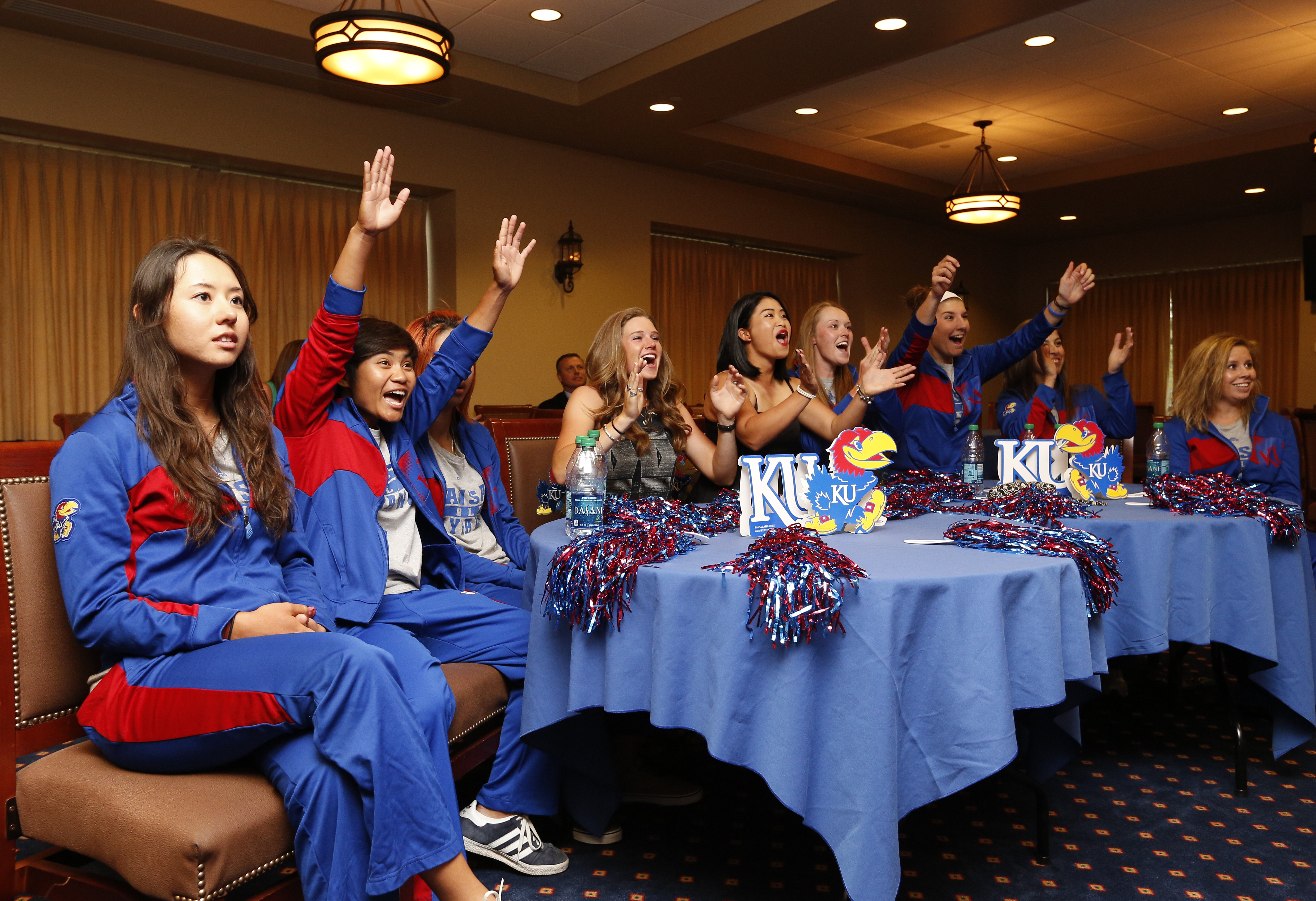 Members of the Kansas University women's golf team react with excitement as the school their seed is announced during a watch party for the 2014 NCAA regional selection show on Monday, April 28, 2014 in Allen Fieldhouse.