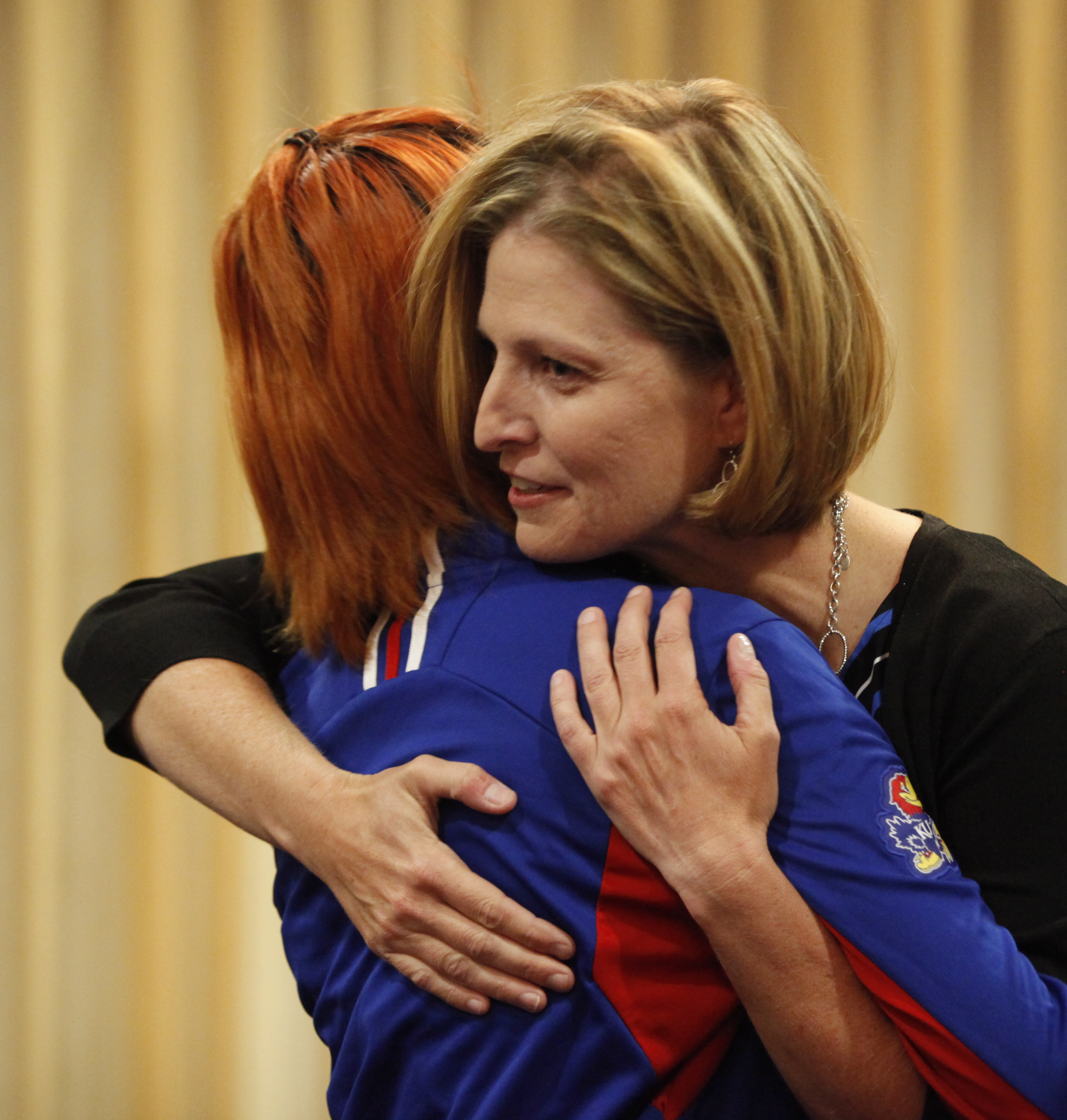 Kansas University women's head golf coach Erin O'Neil hugs Pornvipa Sakdee following a watch party for the 2014 NCAA regional selection show on Monday, April 28, 2014 in Allen Fieldhouse.