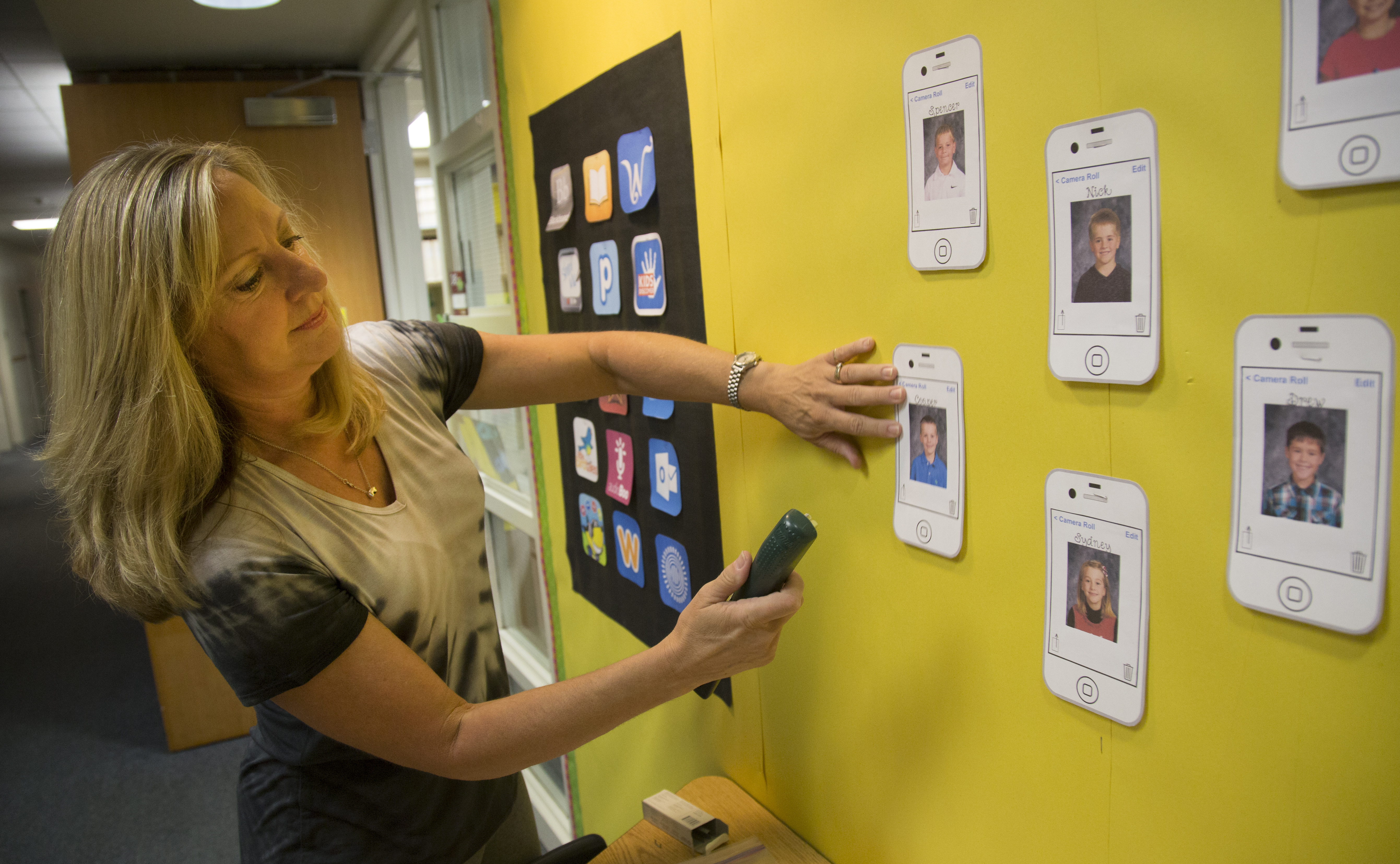 Quail Run Elementary teacher Paula Barr sets up her bulletin board before school starts.