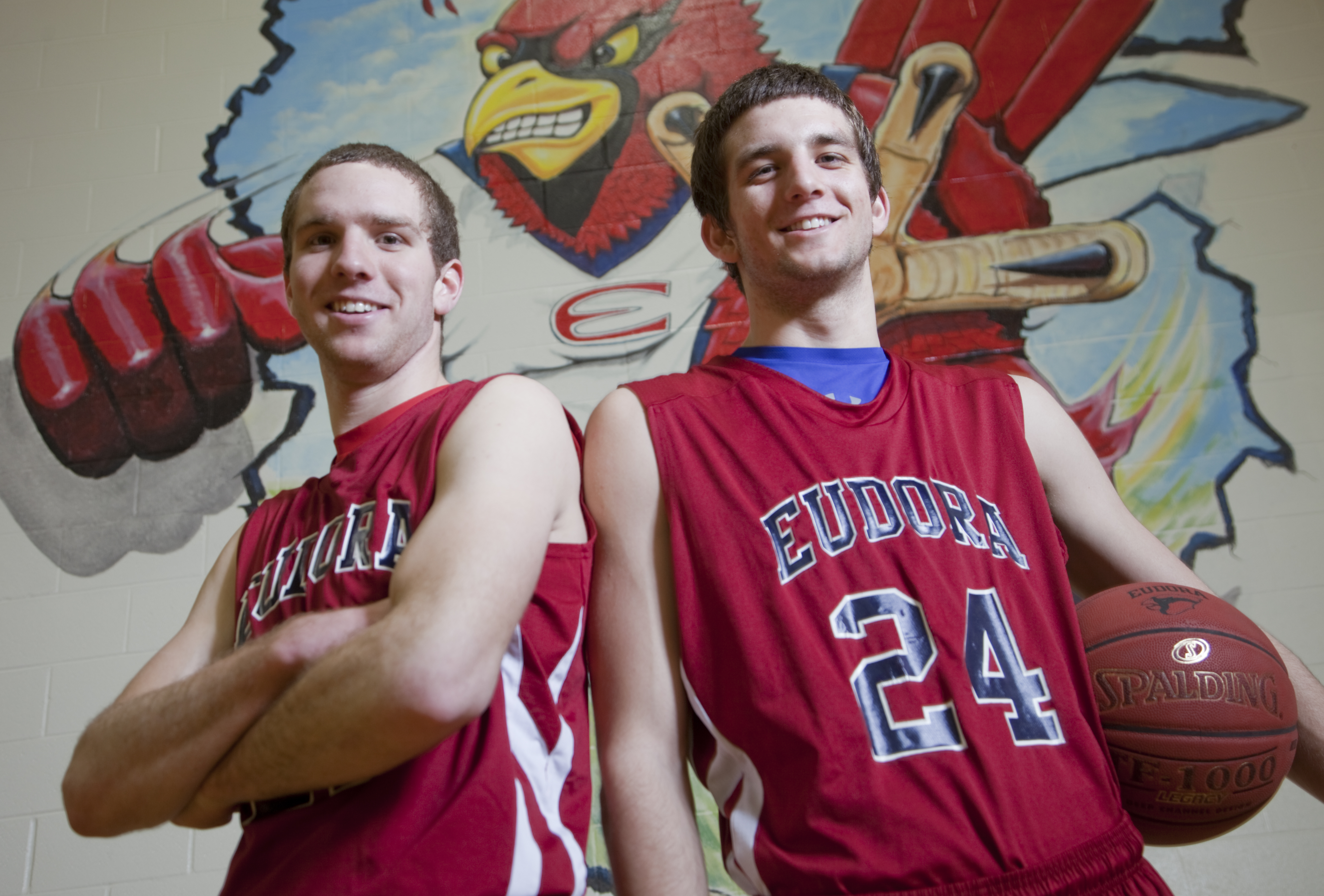 Eudora High senior Andrew Ballock, left, and his brother, freshman Mitchell, play together for the Cardinals’ boys basketball team. Mitchell is already drawing attention from Division I basketball programs and attributes his success to the backyard basketball beatdowns he endured at the hands of his older siblings while growing up.