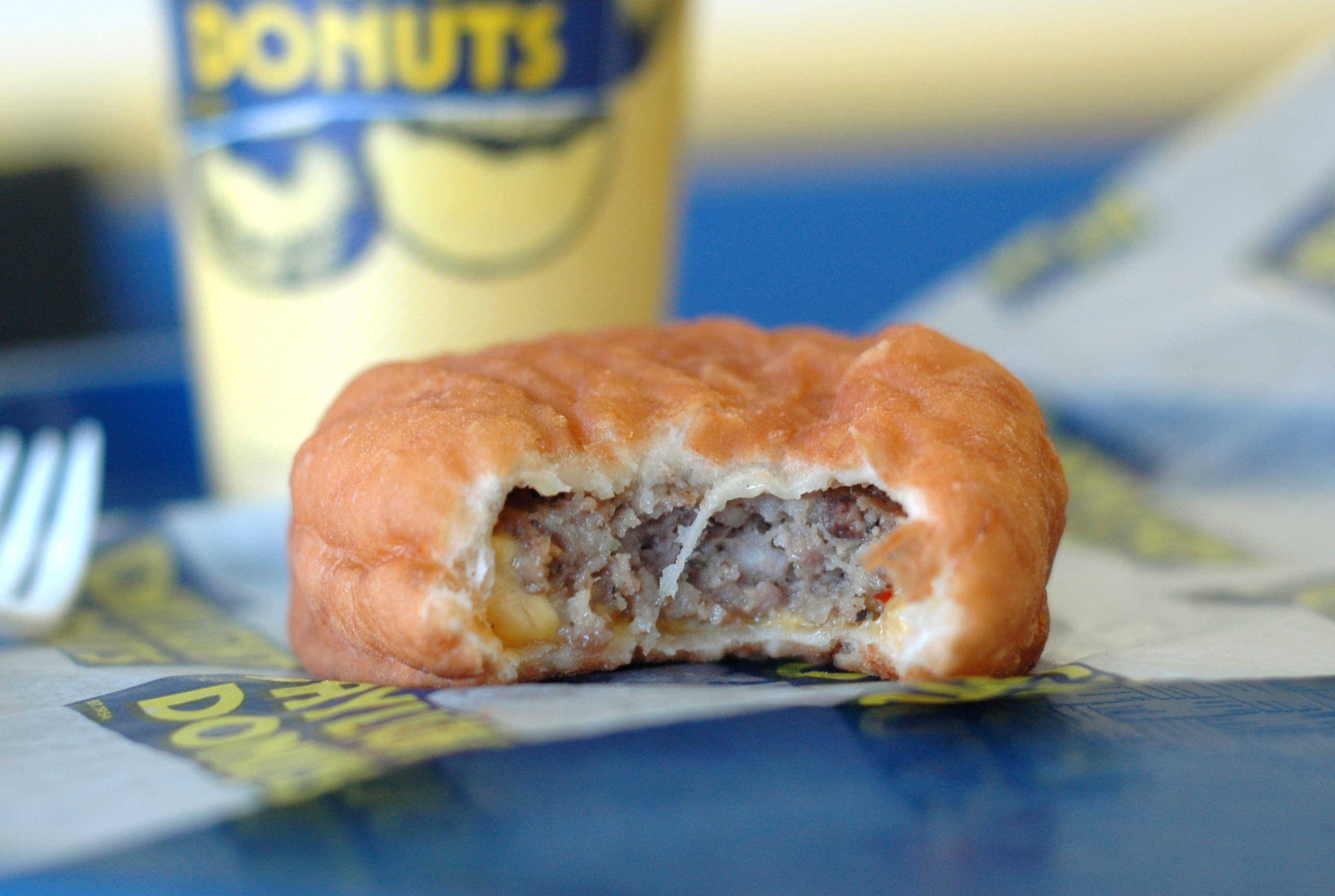 A sausage patty with melted cheese, not sandwiched between slices of English muffin but fried inside a doughnut instead. Kind of like a jelly doughnut’s strange, savory cousin.