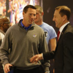 Defensive coordinator Clint Bowen, left, laughs with newly-hired Kansas head football coach David Beaty before Beaty is introduced to the Allen Fieldhouse crowd during halftime of the JayhawksÕ game against Floriday on Friday, Dec. 5, 2014. Beaty is the 38th head coach in the programÕs history.