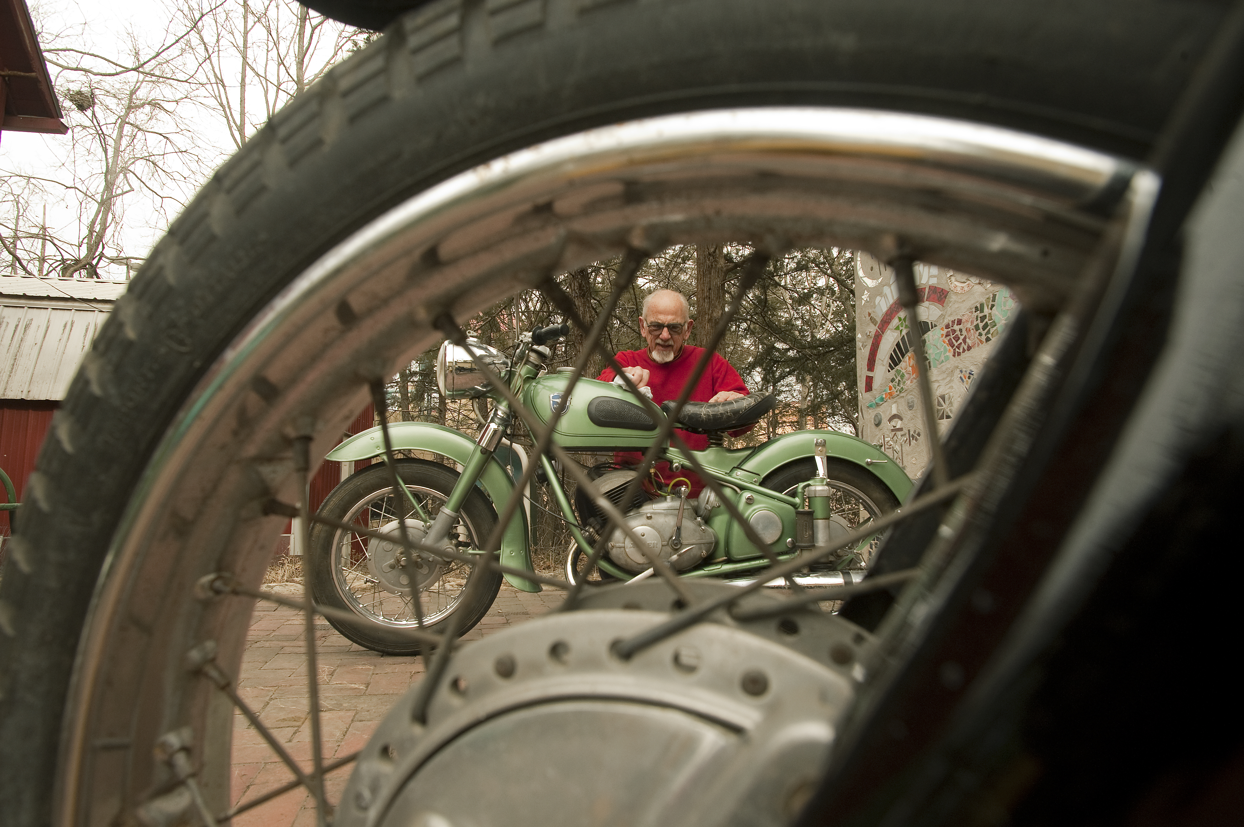 John Gary Brown, of Lawrence, cleans up a 1954 Adler on Thursday in preparation for Sunday's fifth annual Mid-Winter Vintage Motorcycle Show and Swap Meet, to be hosted by the Antique Motorcycle Club of America, at the Douglas County Fairgrounds.