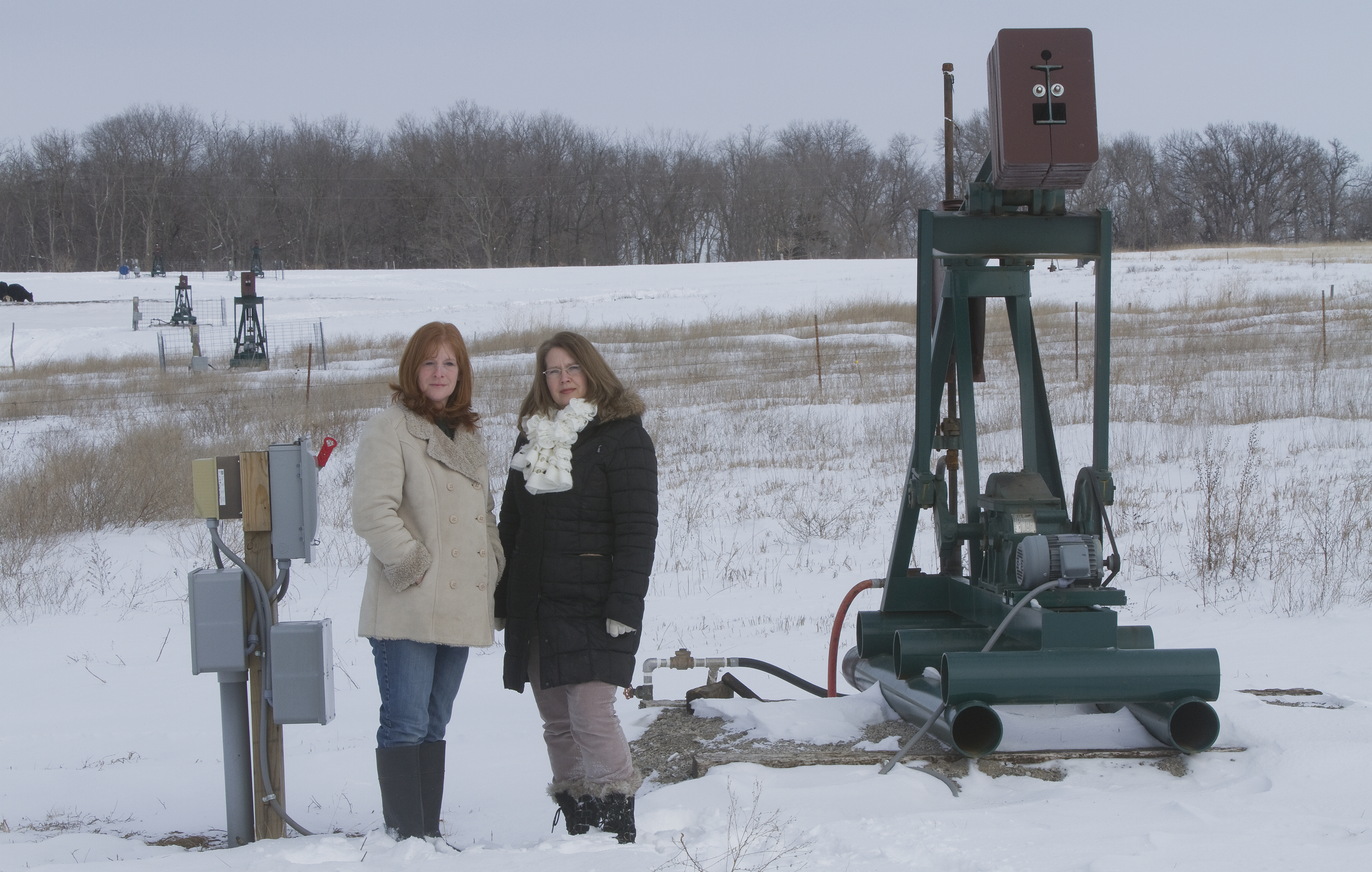 Neighbors Sara Yardley, left, and Amy Adamson live southeast of Baldwin City and are concerned abut the number of oil wells that are on their property and about the prospect of more being drilled too close to their homes.