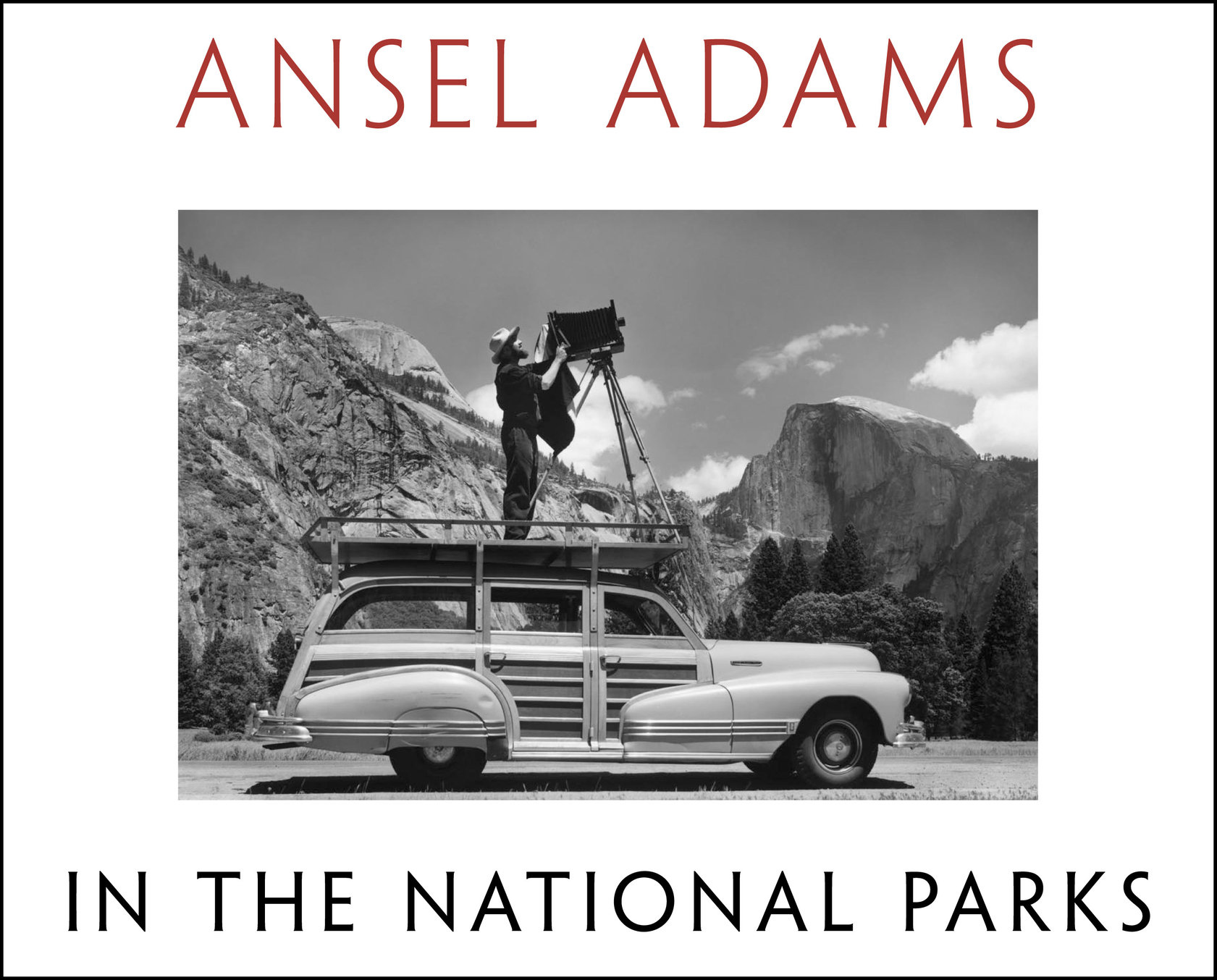 Ansel Adams shown on top of his Ford Woody station wagon around 1941-42 in Yosemite National Park. Adams constructed a mounted platform, where he would perch his large format camera on a tripod and shoot.