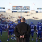 Kansas head coach Charlie Weis watches his team warm up for Baylor on Saturday, Oct. 26, 2013.
