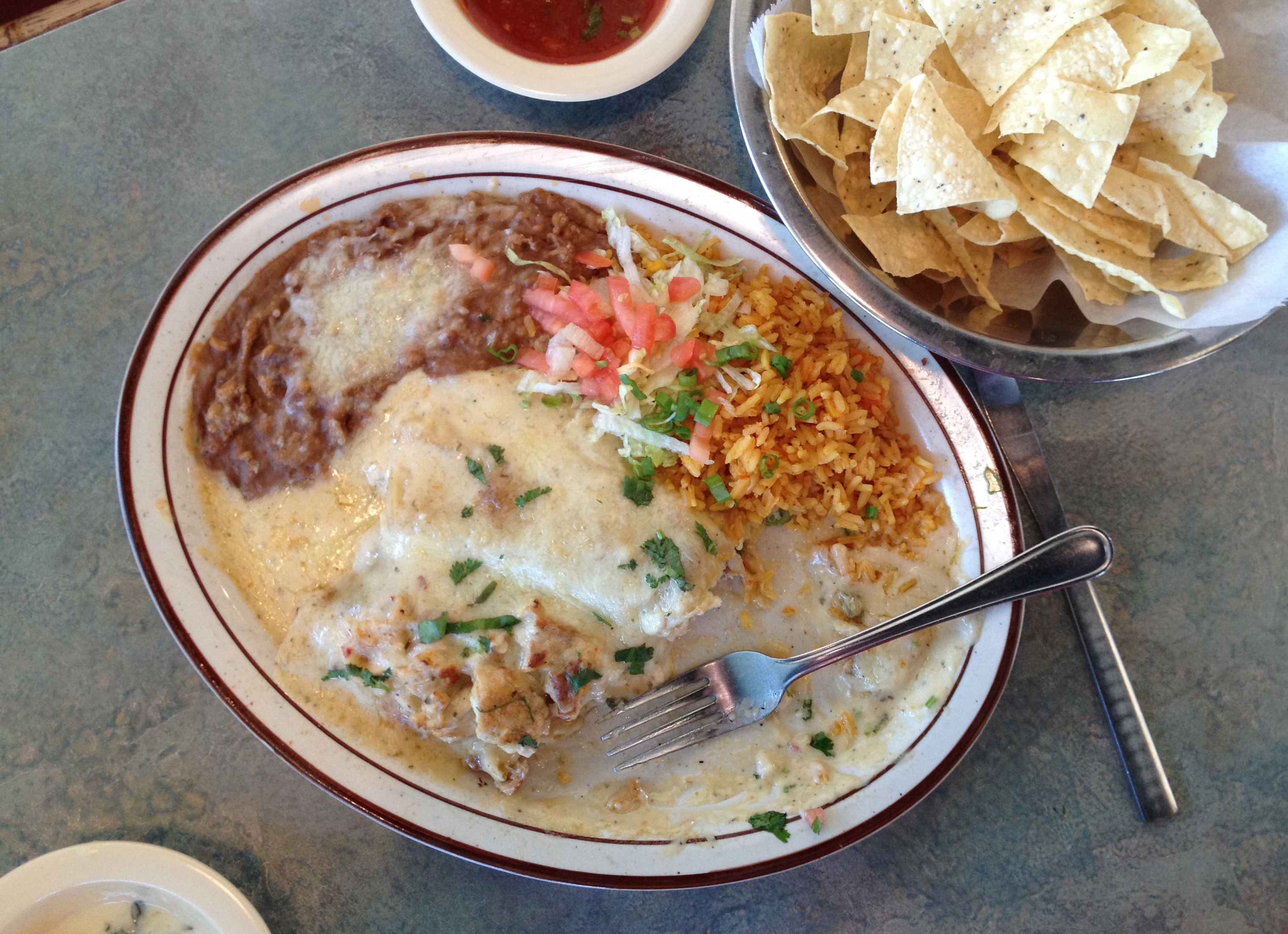 A great many of the entrees at Lawrence’s Mexican restaurants look the same: oval plate, rice, beans, tortilla-encased-something covered with melted cheese. This one is no different on the outside but has something unusual on the inside — okra. The vegetable’s distinct nutty flavor joins shredded chicken under all that queso.