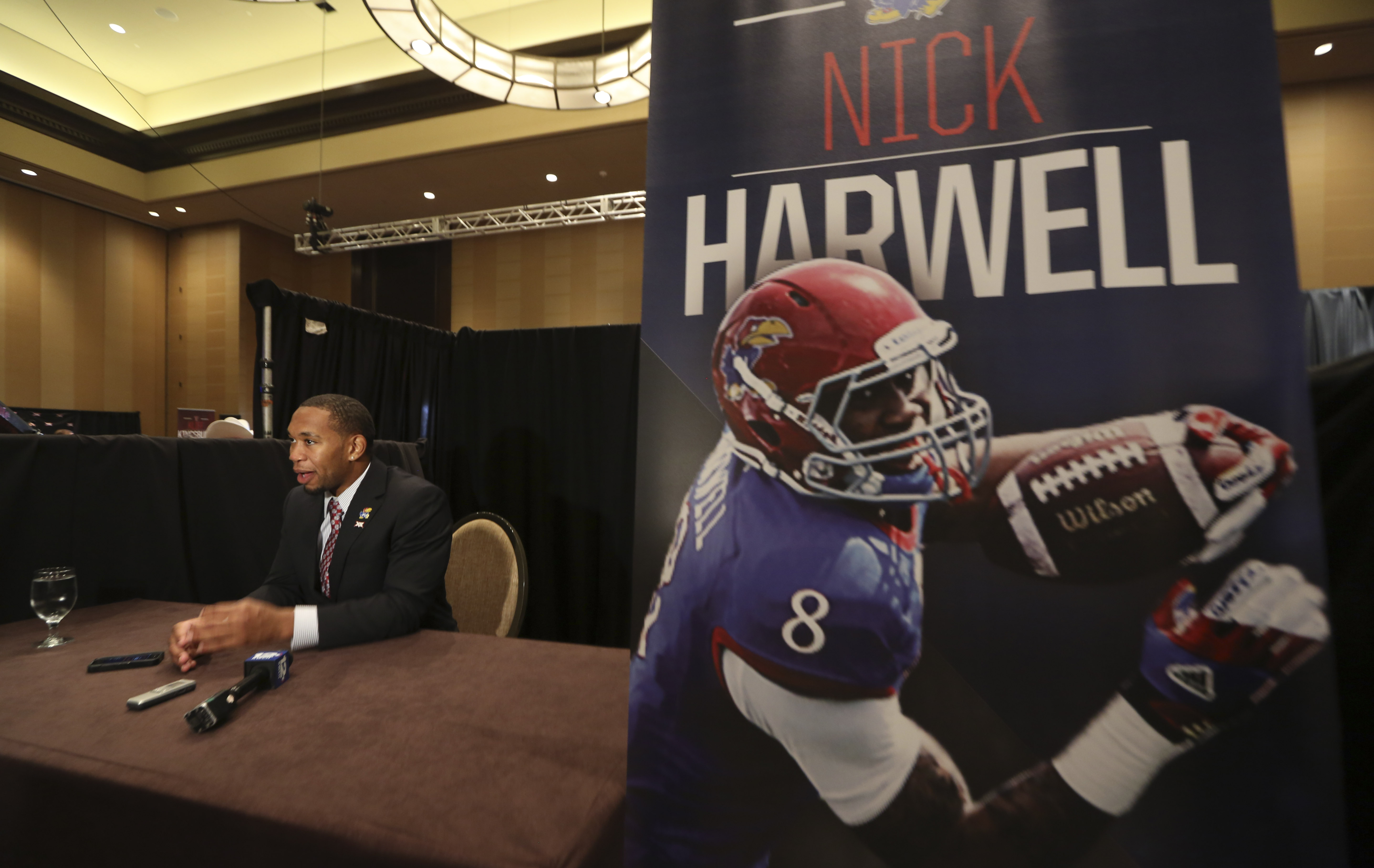 Kansas wide receiver Nick Harwell speaks to a reporter during opening day of Big 12 media days Monday in Dallas.