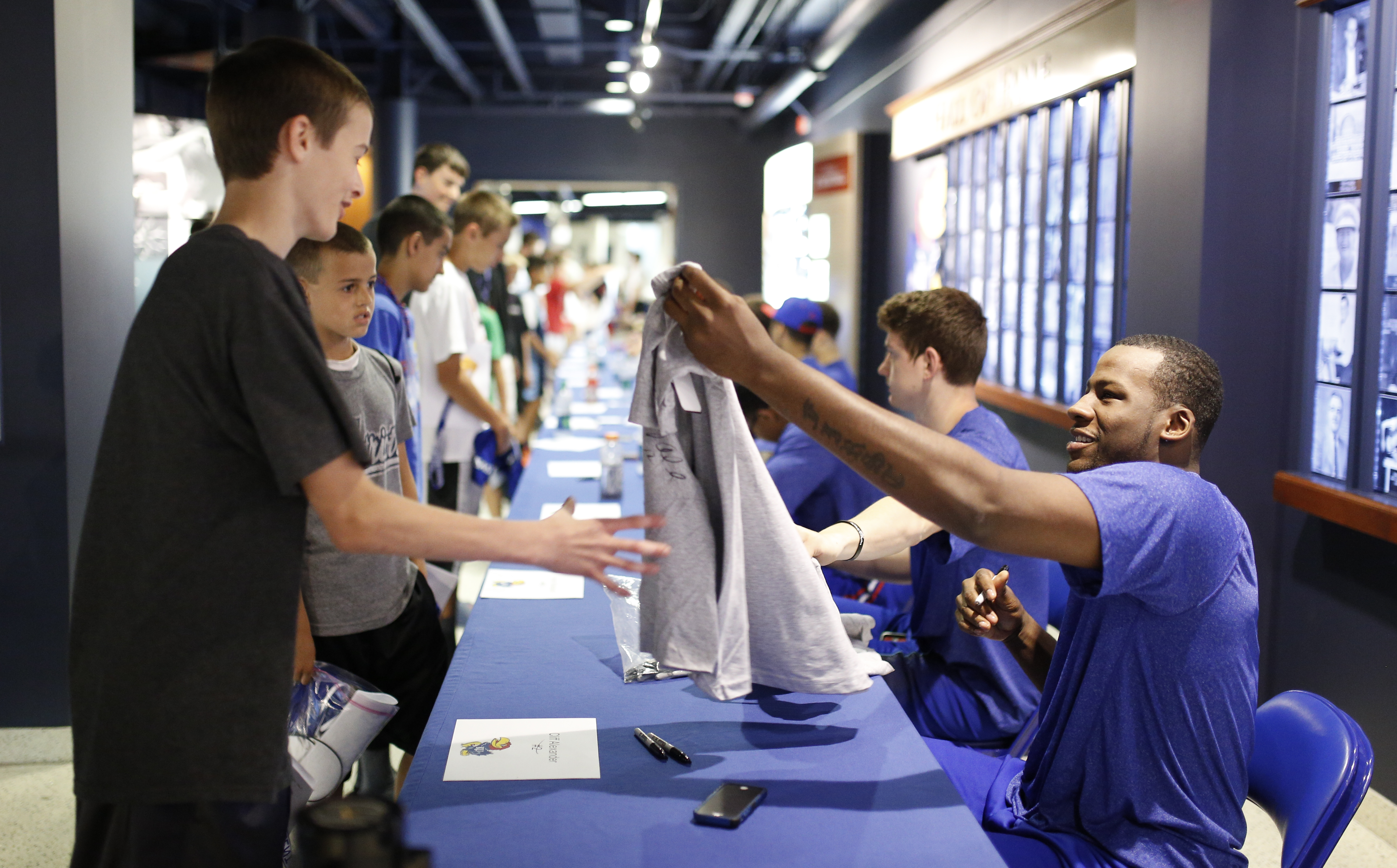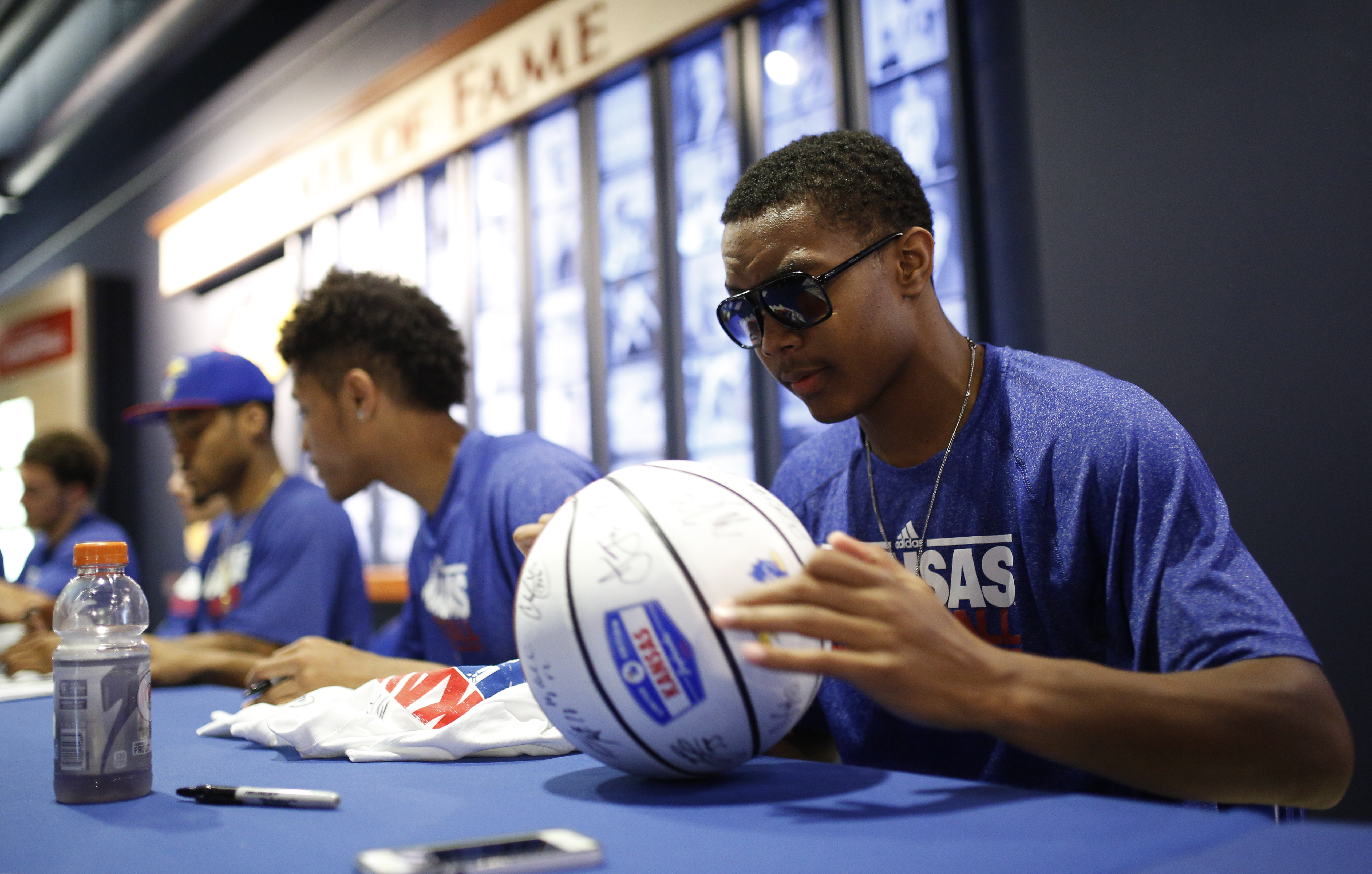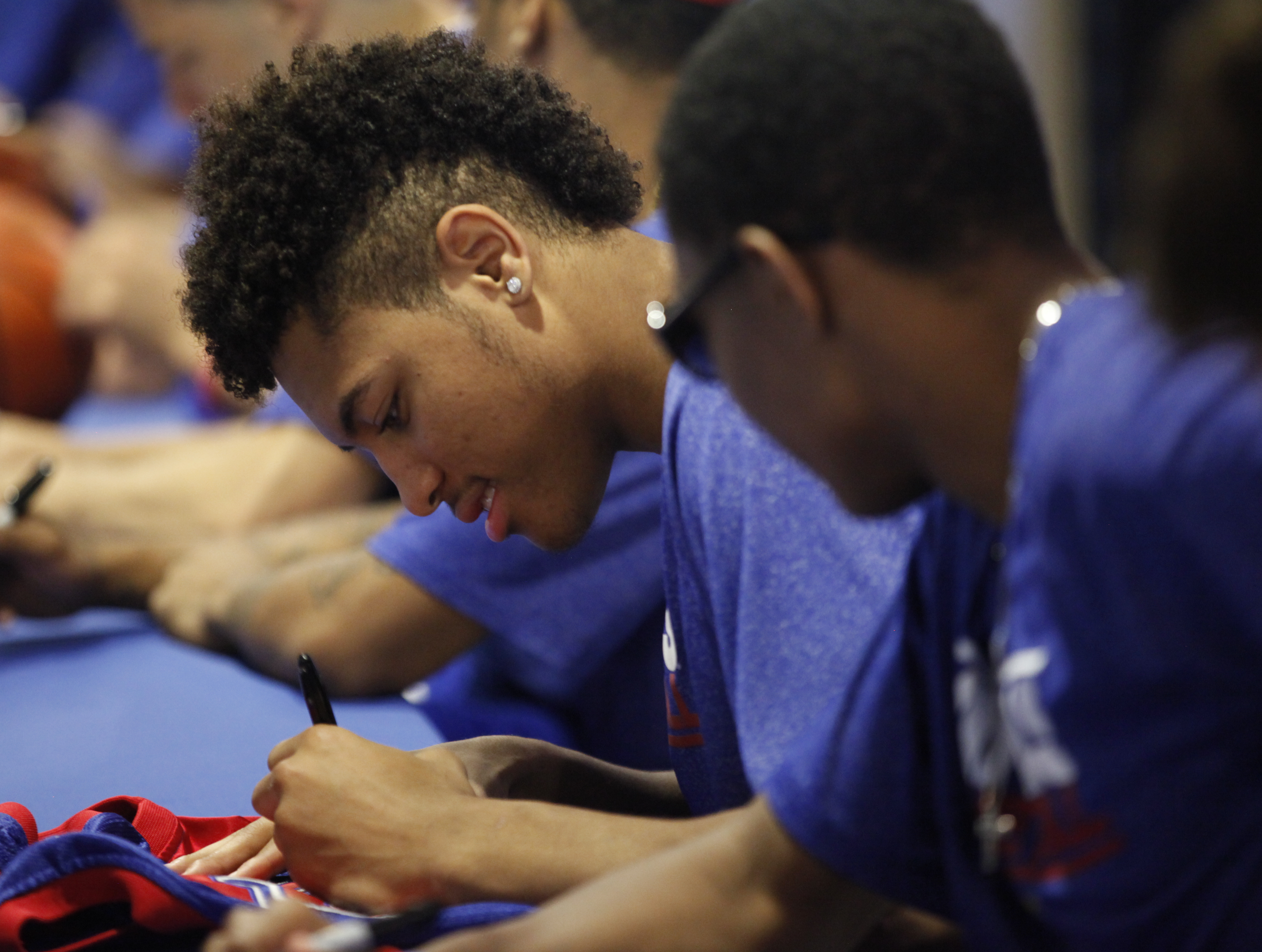 Kansas newcomer Kelly Oubre signs a jersey for a basketball camper along with the rest of the Jayhawks on Sunday, June 8, 2014, at Allen Fieldhouse.