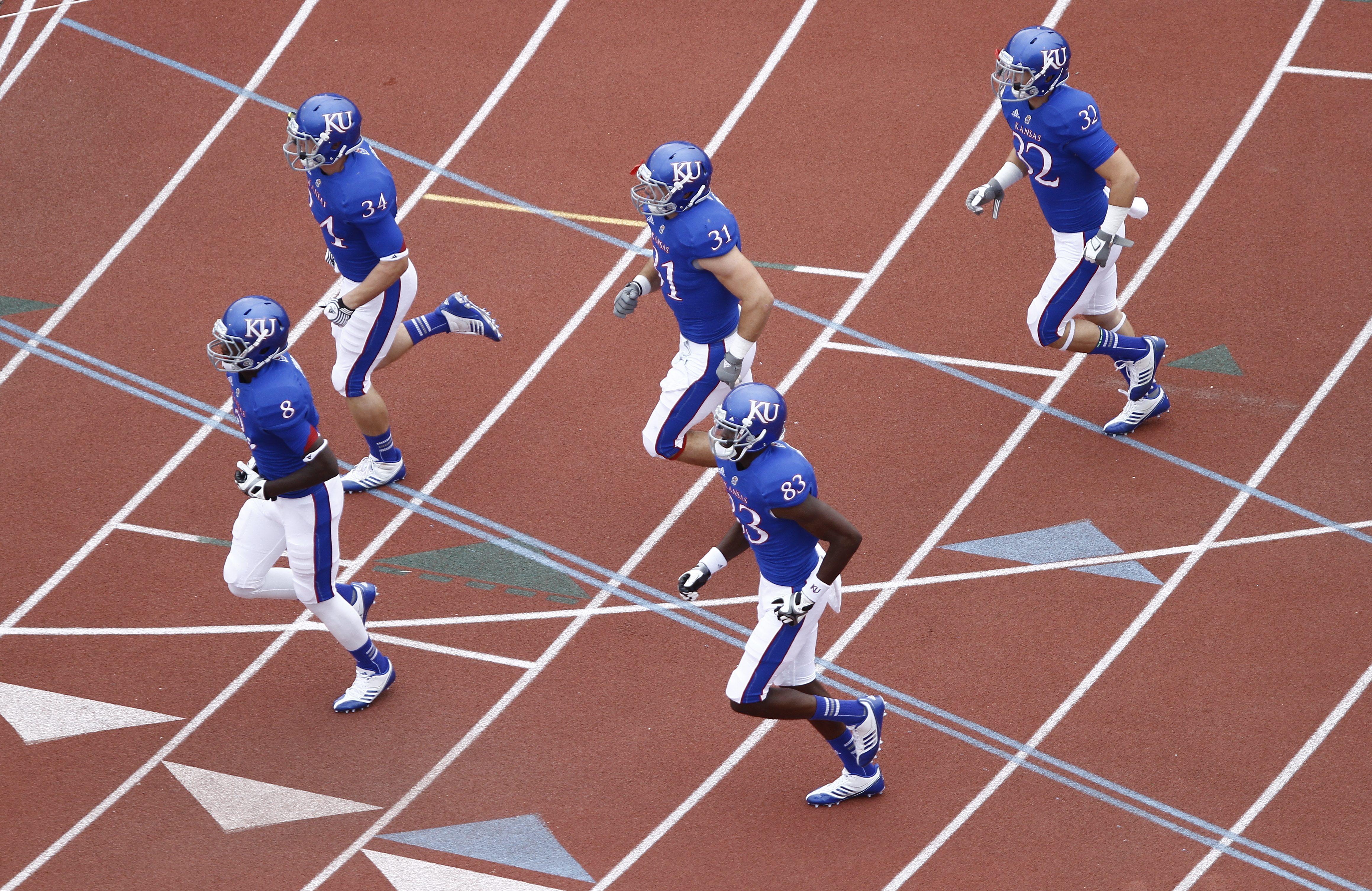 The Kansas Jayhawks take the field prior to kickoff against TCU, Saturday, Sept. 15, 2012 at Memorial Stadium.