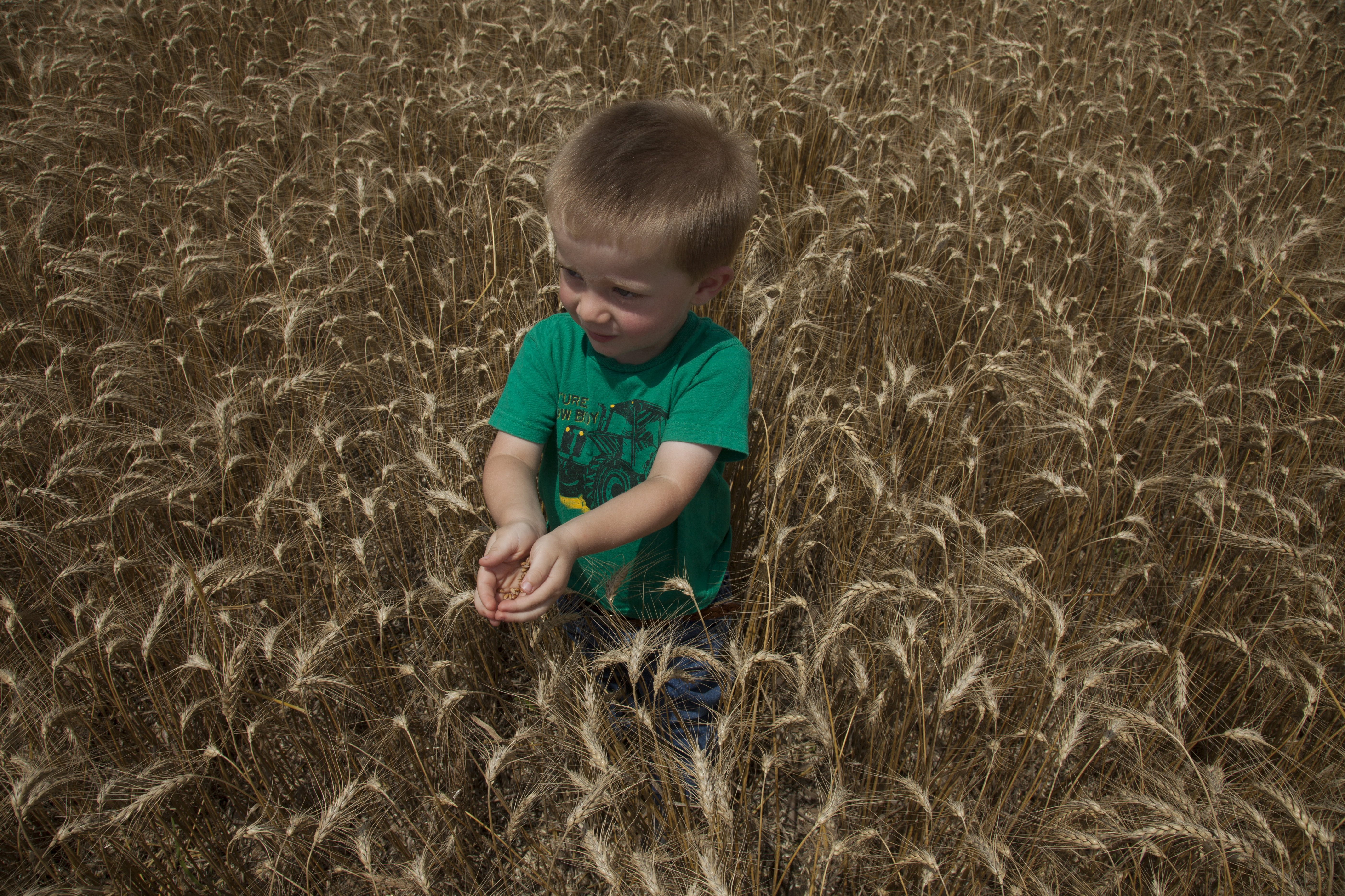The wheat harvest is underway in Douglas County, as 2-year-old Wamego resident Brigham Disberger, great-grandson of local farmer Bill Rice, stands in the rural Baldwin City field where the family was cutting wheat Thursday.